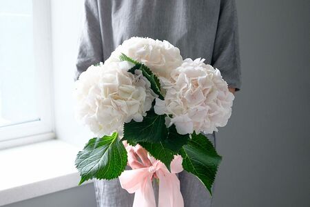 Гортензия белая - 3 шт., атласная лента. Удивительные воздушные и ажурные соцветия гортензии всегда волновали людей своей свежестью и изысканным видом. Дарить гортензию женщине всегда приятно - любая дама будет просто в восторге от столь восхитительного зрелища