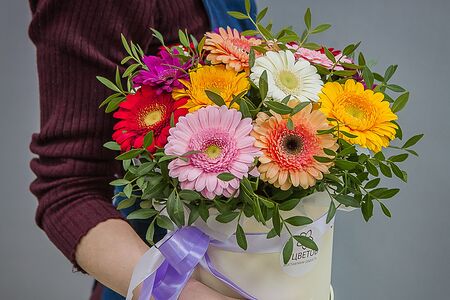 Гербера желтая (3 шт.), гербера красная (3 шт.), гербера розовая (3 шт.), гербера белая (2 шт.), гербера кремовая (2 шт.), гербера фиолетовая (2 шт.), шляпная коробка с оазисом, атласная лента