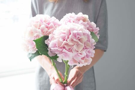 Гортензии розовые - 3 шт., атласная лента. Удивительные, воздушные и ажурные соцветия гортензии всегда волновали людей своей свежестью и изысканным видом. Дарить гортензию женщине всегда приятно - любая дама будет просто в восторге от столь восхитительного зрелища