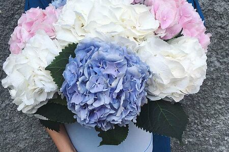 Букет из 9 гортензий микс в шляпной коробке доставка