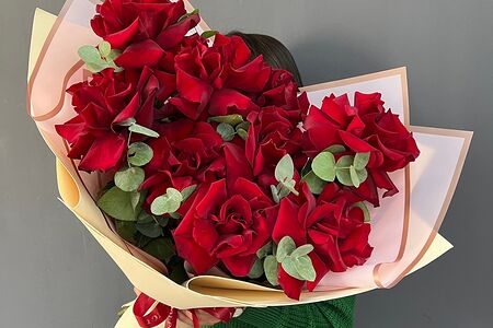 Букет из 9 красных французских роз с эвкалиптом доставка