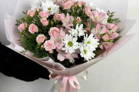 Роза кустовая 5 шт, Хризантема кустовая 3 шт, Альстромерия 3 шт, Зелень 1