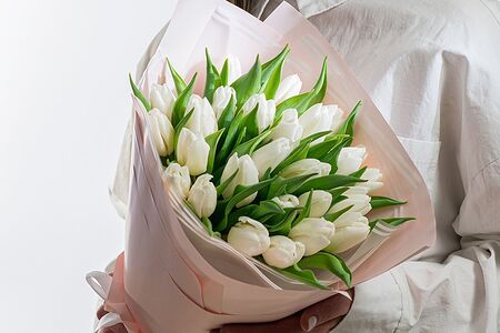 Белые тюльпаны (25 шт.), пленка дизайнерская (2 шт.), лента атласная (1 шт.)