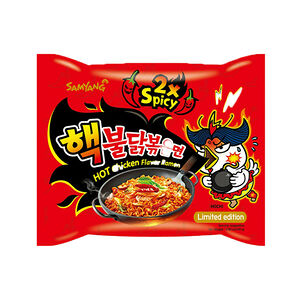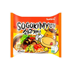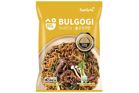 Хороший вариант для тех, кому сложно есть острое – новый Bulgogi Ramen от Samyang. Это жареная лапша с ароматом мяса, приправленная специями. Приправа по вкусу похожа на шашлык: пикантная, слегка сладкая и с оттенком солености. Состав: лапша (85,5%): пшеничная мука, модифицированный крахмал тапиоки, рафинированное пальмовое масло, рафинированная соль, пшеничная глютен, глицерин, соевое масло, экстракт лука, регулятор кислотности (карбонат калия безводный E501i, карбонат натрия e500, фосфат натрия двухосновный E339ii, лимонная кислота E330, эмульгатор лецитин E322 i), масло со вкусом зеленого чая. суп (14,5%): порошок соевого соуса, белый сахар, порошок дрожжевого экстракта, усилитель вкуса (l-глутамат E621, дизодий 5-рибонуклеотид E635), сушеный лук, карамельный порошок, соль, сушеный чеснок, жареный кунжут, луковый порошок, чесночный порошок, немолочные сливки, порошок черного перца, соевое масло, сушеный красный перец, экстракт паприки. Энергетическая и пищевая ценность на порцию 80 г: 340 ккал, белки 8 г, жиры 10 г, углеводы 55 г. Информация о аллергенах: пшеницу, глютен, сою. Способ приготовления: положить лапшу в 400 мл кипятка и варить 5 мин. слейте воду (оставив 5 столовых ложек). вылить суп в лапшу, жарьте, перемешивая в течении 30 секунд и подавайте.