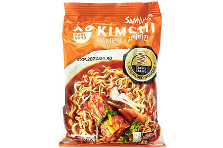 Ароматный рамен Samyang со вкусом известного корейского блюда Кимчи — это быстрый и вкусный способ попробовать настоящую корейскую пищу, не выходя из дома. Состав: лапша (86,2%): пшеничная мука, рафинированное пальмовое масло, модифицированный крахмал тапиоки, рафинированная соль, эмульгатор (соевый лецитин), регулятор кислотности (карбонат калия безводный E501i, карбонат натрия e500, фосфат натрия двухосновный E339ii, лимонная кислота E330, эмульгатор лецитин E322 i), загуститель (гуаровая камедь (e412)), масло со вкусом зеленого чая (идентичное натуральному); суп (13,8%): порошок кимчи, порошок соевого соуса, белый сахар, смешанный пряный порошок (перец чили, чеснок, лук), дрожжевой порошок, сушеный бок-чой, порошок красного перца, регулятор кислотности (dl-яблочная кислота), сушеные хлопья кимчи (капуста напа, соль, порошок красного перца, чеснок, имбирь), сушеный чеснок, черный перец порошок, масло семян красного перца, перец, ароматизатор чеснока, карамельный порошок. Энергетическая и пищевая ценность на порцию 80 г: 360 ккал/1506 кДж, белки 7 г, жиры 13 г, углеводы 53 г. Информация об аллергенах: пшеницу, глютен, сою. Способ приготовления: положить лапшу в 400 мл кипятка и варить 5 мин. слейте воду (оставив 5 столовых ложек). вылить суп в лапшу, жарьте, перемешивая в течении 30 секунд и подавайте.
