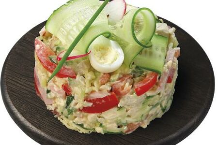 Срок годности в днях: 3Состав: Состав продукта: картофель отварной стерилизованный, майонезный соус(масло подсолн.рафинир. дезодорир.,вода пит.,сахар,загуст-ль-крахмал кукуруз. модифицир.,яичн.желток, соль,регул-р кисл-ти Е260,стабил-ор Е415,конс-ты:Е211,Е202; аромат-ор,пищ. крас-ль Е160а, антиокис-ль Е385), огурцы свежие, томаты свежие, яичная масса отварная, мясо куриное отварное, ветчина(свинина,говядина,вода,соль,соевый белок,крахмал,глюкоза,стабилизаторы-каррагина,камедь,фосфаты пищевые,антиоксидант(лакталин),пищевой ароматизатор идентичный натуральному(говядина),усилитель вкуса-глутамат натрия, антиокислитель-Е300, пищевой краситель идентичный натур.(кошенила), стабилизатор цвета (нитрат натрия)), сыр голландский(изготовлен из пастеризованного молока с использованием мезофильных молочнокислых микроорганизмов,сычужно-говяжьего молокосвертывающего ферментного препарата животного происхождения, соли,хлористого кальция, консерванте-азотнокислого калия), соль,перец черн.мол. Пищевая ценность(среднее значение) в 100 гр продукта: белки,гр-5,4,жиры,гр-18,7,углеводы,гр-7,3. Энергетическая ценность,ккал-218,9, кДж-916,57. Рекомендации по приготовлению: готов к употреблению. Возможно содержание в следовых количествах горчицы, молока, орехов,сельдерея, сои,моллюсков, ракообразных, рыбы и продуктов переработки перечисленных компонентов. Упаковано с помощью газовой модифицированной среды.Пищевая ценность: Калорийность: 219Белки: 5.4Жиры: 18.7Углеводы: 7.3Страна изготовления: РоссияПроизводитель: Магнит