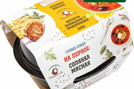 Срок годности в днях: 10Состав: Солянка мясная: вода, картофель, лук репчатый, огурцы маринованные (огурцы, вода питьевая, соль пищевая поваренная, регулятор кислотности E260, пряности и специи (семя горчицы), уплотнитель (хлорид кальция), консерванты (E211, E202), томатная паста (томатная паста, вода), ветчина, (свинина, вода, крахмал картофельный, соль, белок соевый, белок яичный сухой, загустители (E407, E410, E412), сахар, регулятор кислотности (E450i, E451ii), белок животный, белок молочный, клетчатка пшеничная, ароматизаторы, усилитель вкуса и аромата (E621), краситель пищевой (E120), фиксатор окраски (E250)), говядина, свинина, сервелат (свинина, говядина, шпик, мясо куриное, вода, белок животный, соль, белок соевый, пряности (в том числе горчица), регулятор кислотности (E450iii, E451i), сахар, усилитель вкуса и аромата (E621), антиокислители (аскорбиновая кислота, изоаскорбат натрия), краситель пищевой (краситель рисовый), ароматизатор, фиксатор окраски (нитрит натрия)), куриные грудки к/в (грудка куриная, вода, соль, сахар, регуляторы кислотности (E450i, E451i), белок молочный, загуститель (E407), консервант (E262i, E262ii), усилитель вкуса и аромата (E621), антиокислители (аскорбат натрия, лимонная кислота), фиксатор окраски нитрит натрия)), лимон, специи. Котлета домашняя с макаронами: макароны (мука пшеничная, вода), говядина, свинина, масло подсолнечное рафинированное дезодорированное, батон нарезной (мука пшеничная хлебопекарная высшего сорта, вода питьевая, сахар, масло подсолнечное рафинированное дезодорированное, дрожжи хлебопекарные, соль, добавка комплексная пищевая (мука пшеничная, фермент микробного происхождения, антиокислитель – кислота аскорбиновая)), лук репчатый, соль, чеснок, специи.Пищевая ценность: Калорийность: 70Белки: 3.5Жиры: 3Углеводы: 7Страна изготовления: РоссияПроизводитель: Домашний очаг