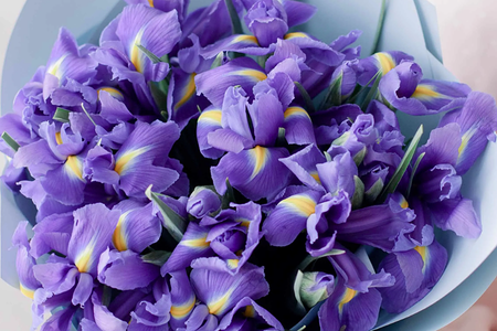 Букет из 25 синих ирисов в голубой пленке доставка