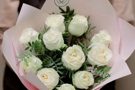 Букет из 11 белых пионовидных роз Titanium 40 см c фисташкой доставка