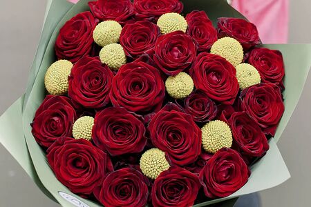 Букет из 21 красной розы 35-40 см (Россия) и 10 краспедий доставка