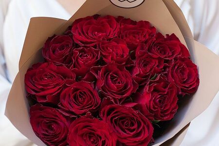 Букет из 15 красных роз 40 см (Кения) в кремовой пленке доставка