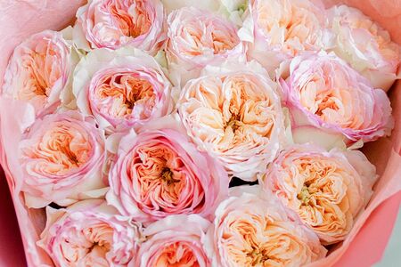 Букет из 15 персиковых пионовидных роз Flash Back 40 см в розовой пленке доставка