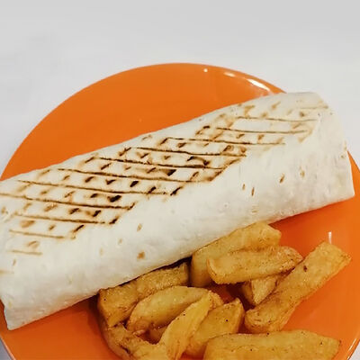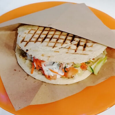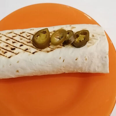 Лаваш, куриное филе жареное, соус чесночный, овощной салат, халапеньо