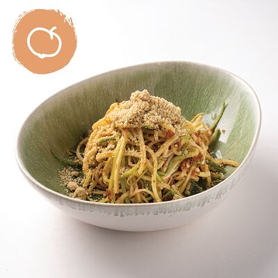Спагетти, Нутовый фарш, Томаты, Морковь, Фасоль стручковая, Репчатый лук, Красный лук, Сельдерей, Чеснок, Паприка, Кориандр, Томатный соус, Вегетарианский сыр