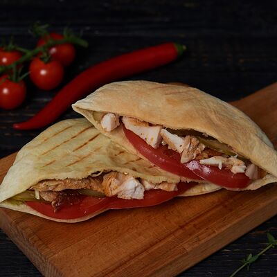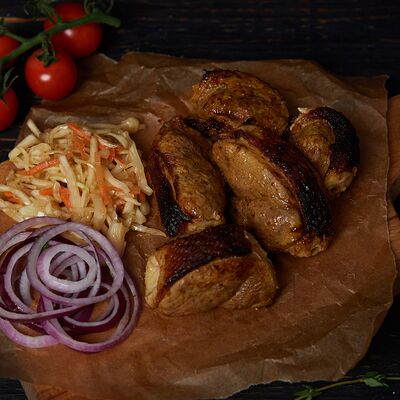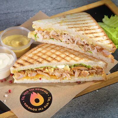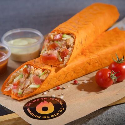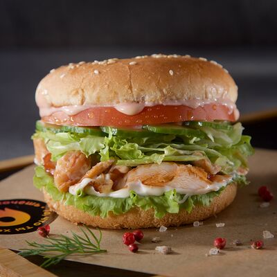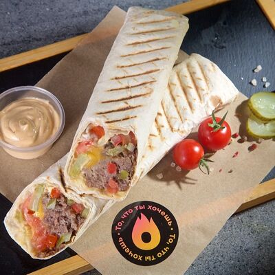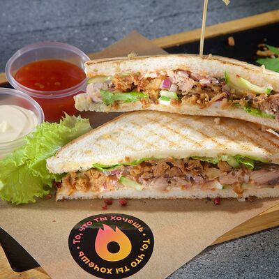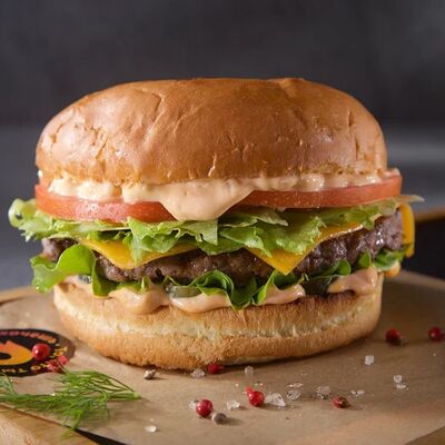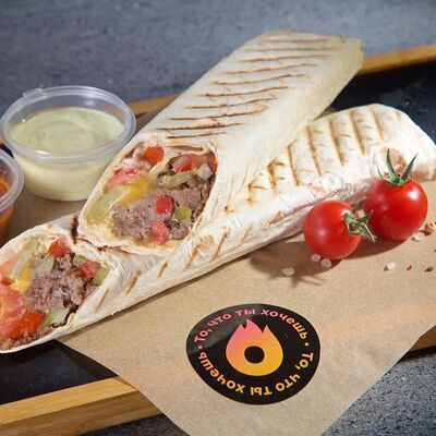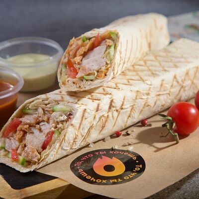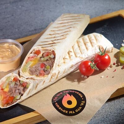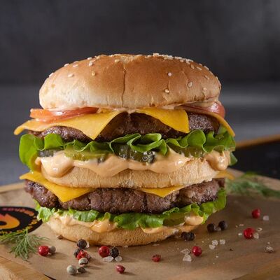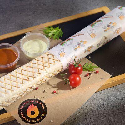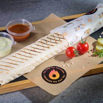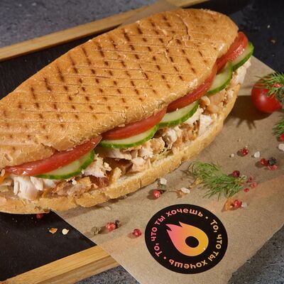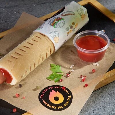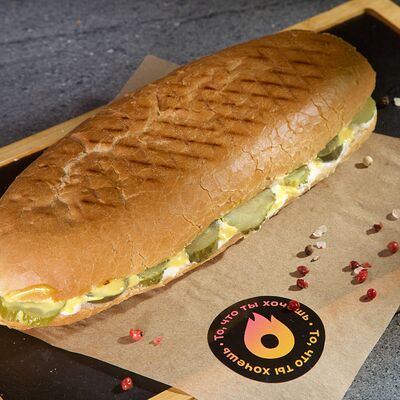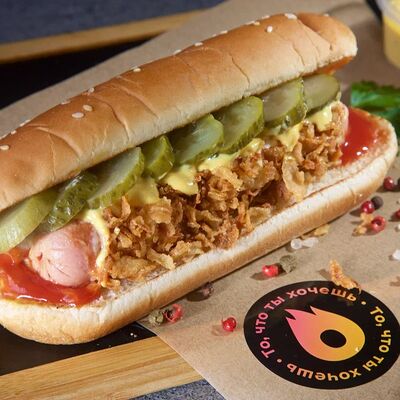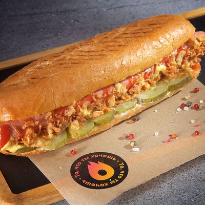 Турецкий багет, огурец маринованный, лук жареный, кетчуп, горчица, майонез, двойная сосиска