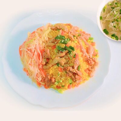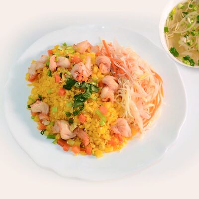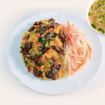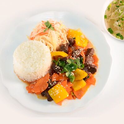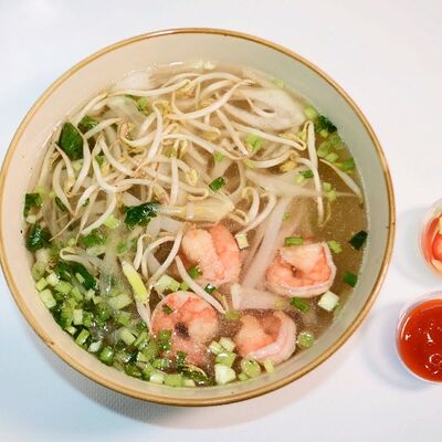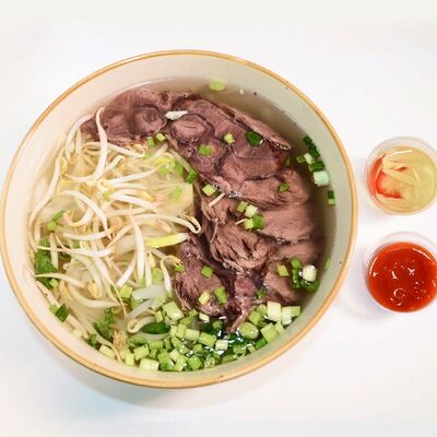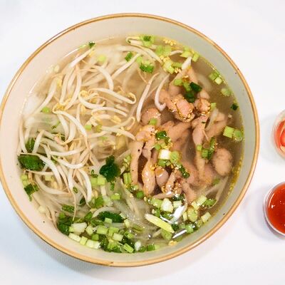 Рисовая лапша, лук, кинза, ростки бобов, говядина