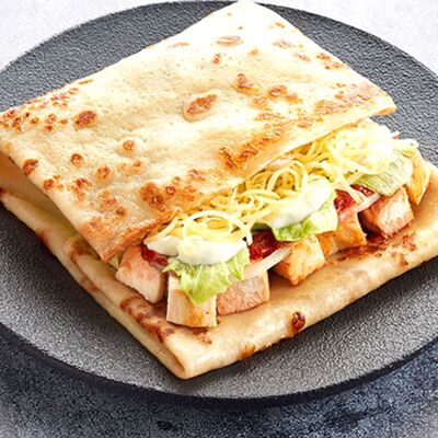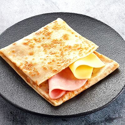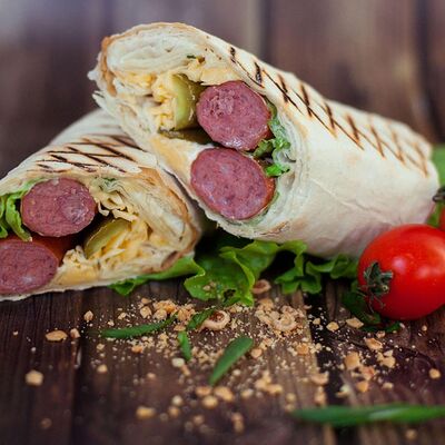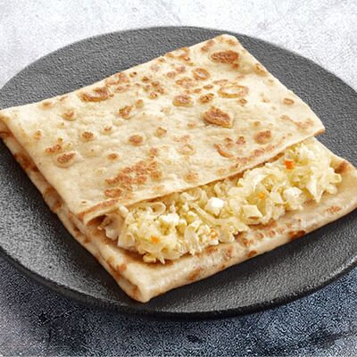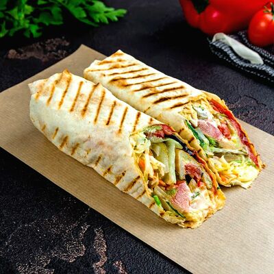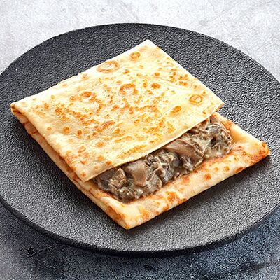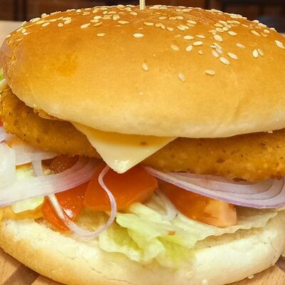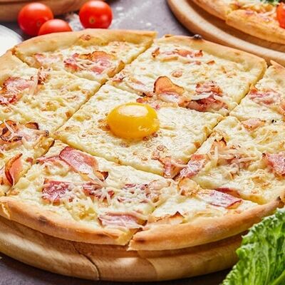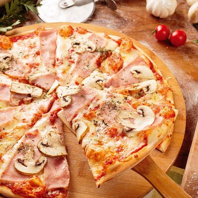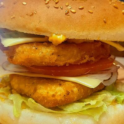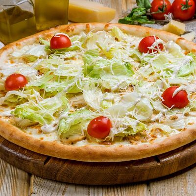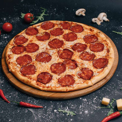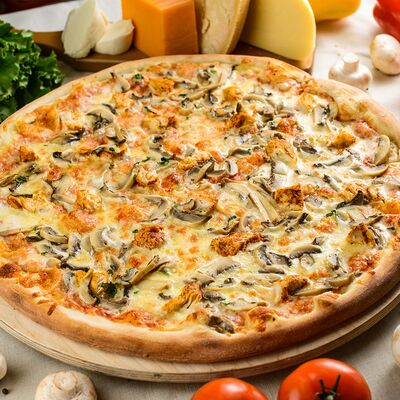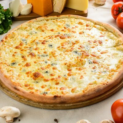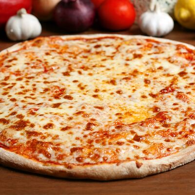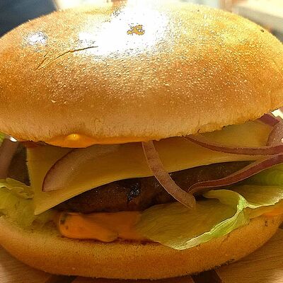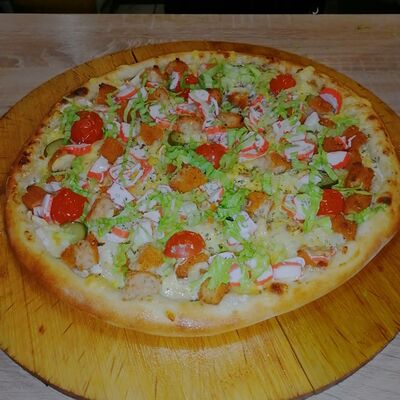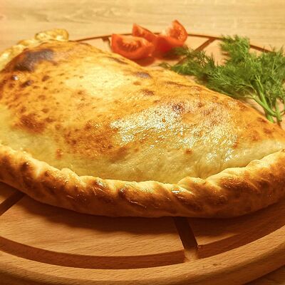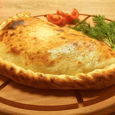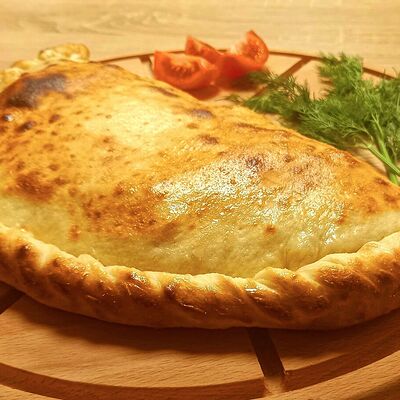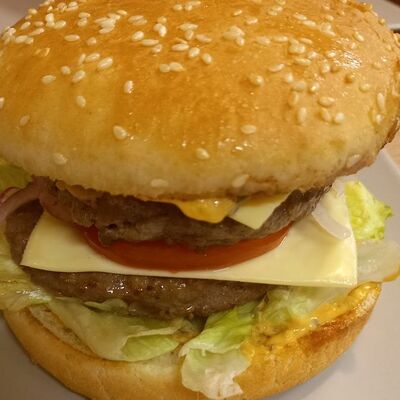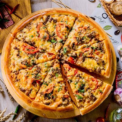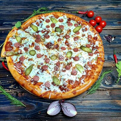 Тесто, томатный соус, говяжий фарш, сыр моцарелла, помидор, огурец маринованный, лук