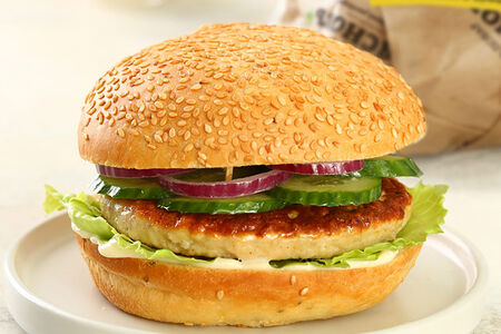 На мягкой булочке с кунжутом собрали всё самое любимое: сочную куриную котлету, горчичный соус с деликатной пикантностью, слайсы сочных свежих огурчиков и колечки лука для вкуса.
