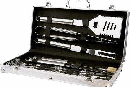 Набор включает в себя 14 предметов: лопатку , щипцы , вилку для мяса , нож для мяса , кисть для смазки, 4 столовых вилки, 4 столовых ножа, алюминиевый чемодан для переноски и хранения