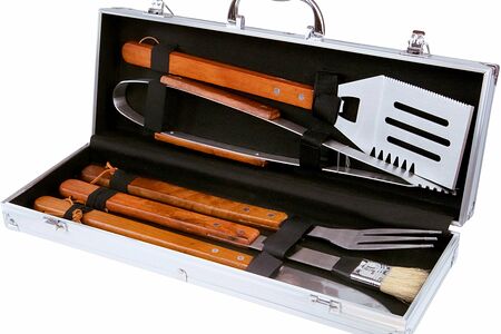 Набор включает лопатку 43,5 см/1,5 мм, щипцы 42,5 см/1,5 мм, вилку 43 см/1,5 мм, нож 42 см/1,5 мм, кисть для смазки 43 см. Набор упакован в алюминиевый кейс-футляр для хранения и переноски размером 46х16х8 см.
