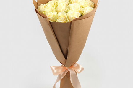 Атласная лента (1 шт.), роза Аваланш (60 см) (15 шт.), упаковка бумага (1 шт.)