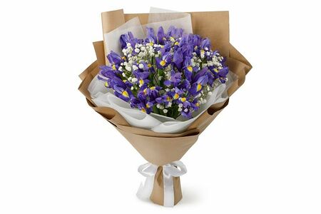 Атласная лента (1 шт.), Гипсофила (3 шт.), Ирис (синий; 2 шт.)