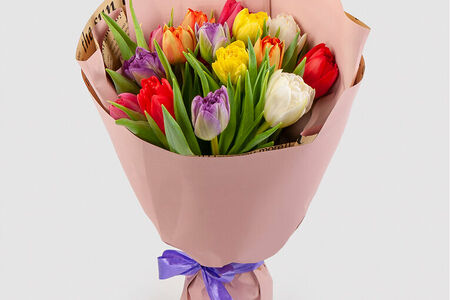 Букет 15 тюльпанов в розовой бумаге, микс 40 см доставка
