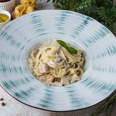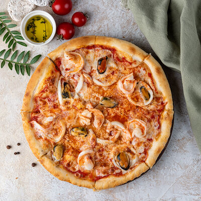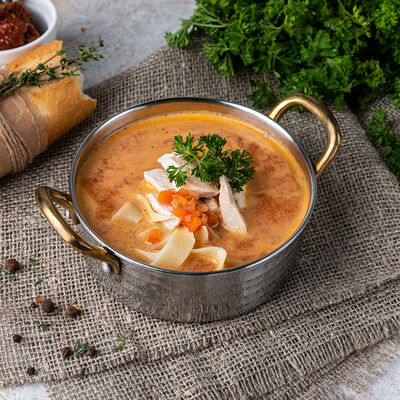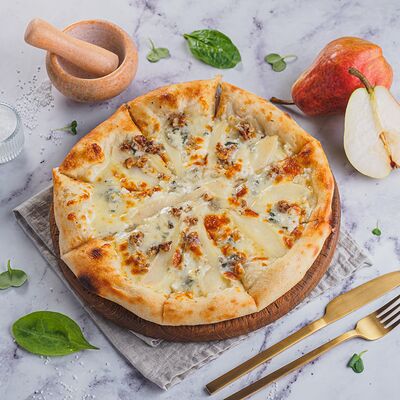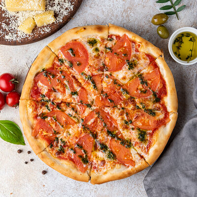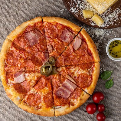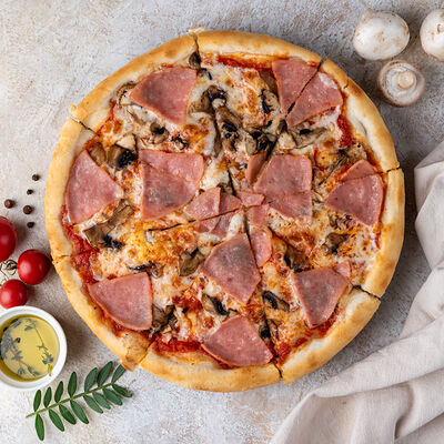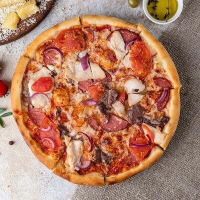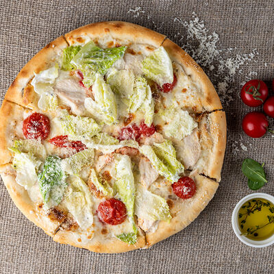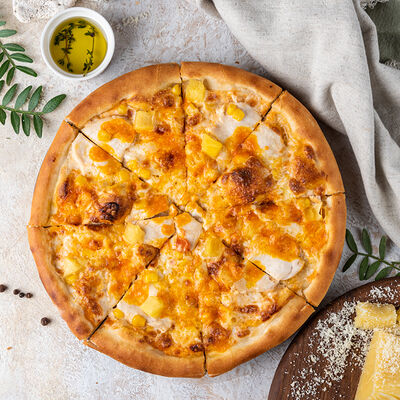 Куриное филе, кукуруза, ананасы, сливочный соус, сыр чеддер и моцарелла (25 см)