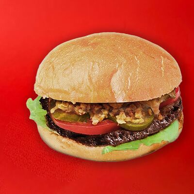 Котлета из говядины, сыр, сырный соус с трюфелем, листья салата, томаты, маринованные огурцы
