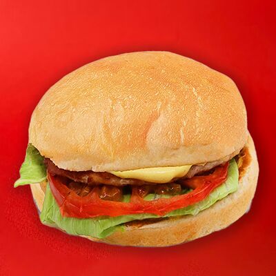Котлета из говядины, сыр, сырный соус с трюфелем, листья салата, томаты, маринованные огурцы