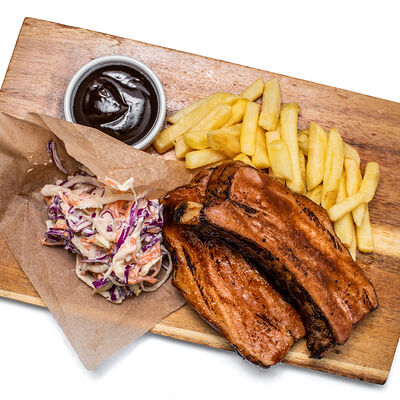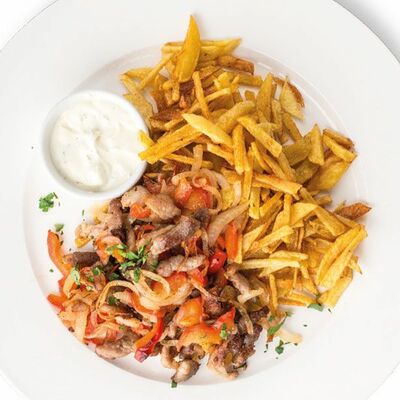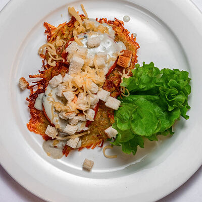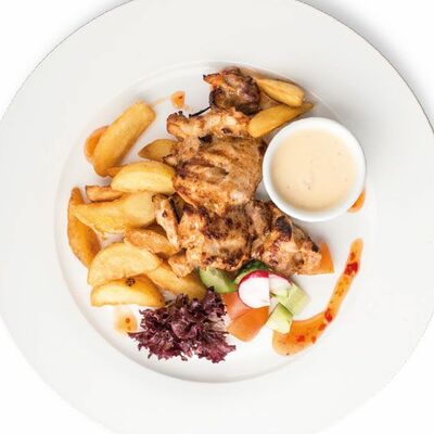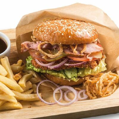 Куриное филе, помидоры, маринованные огурцы, лук, бекон, картофель фри, салат, соус Ранч