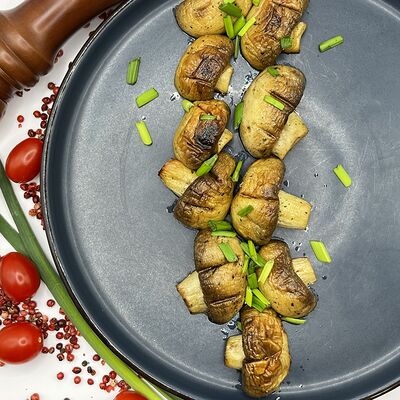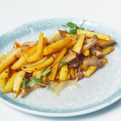 Картофель, шампиньоны, свежая зелень, репчатый лук, подается со сметаной