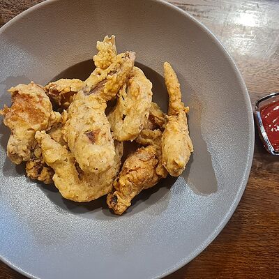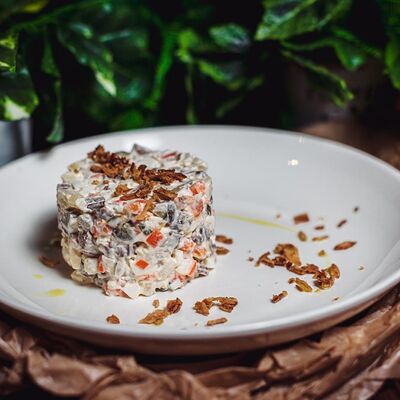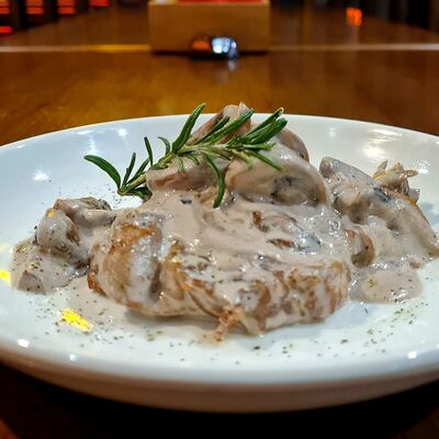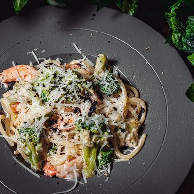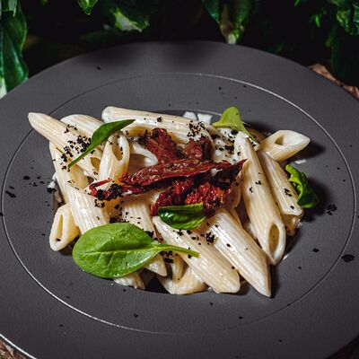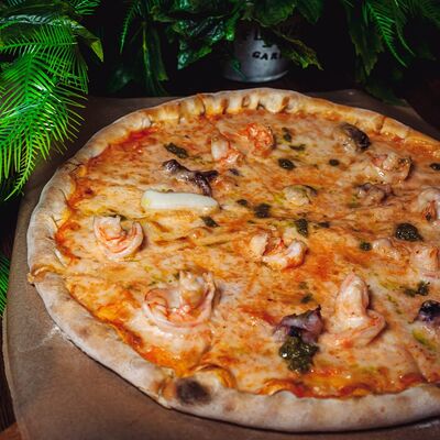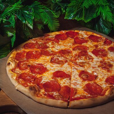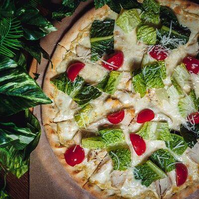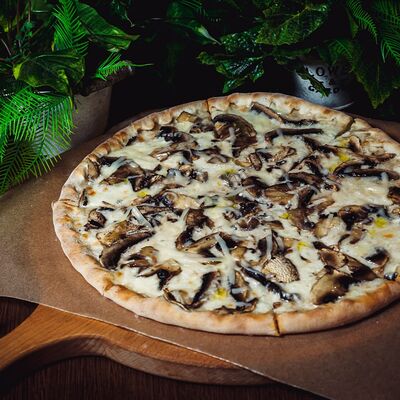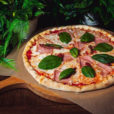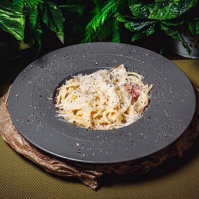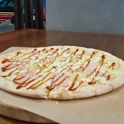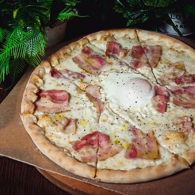 Тесто, соус сливочный, сыр моцарелла, бекон, яйцо, перец фреш (30 см)