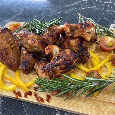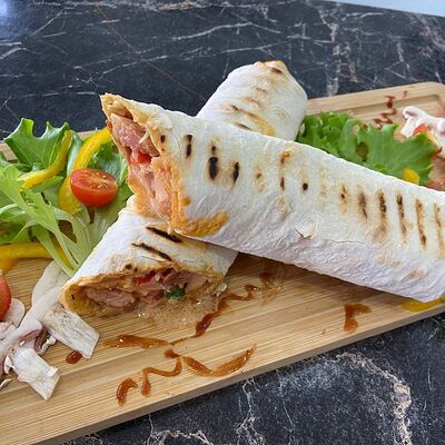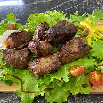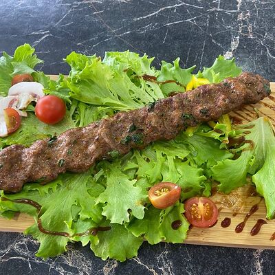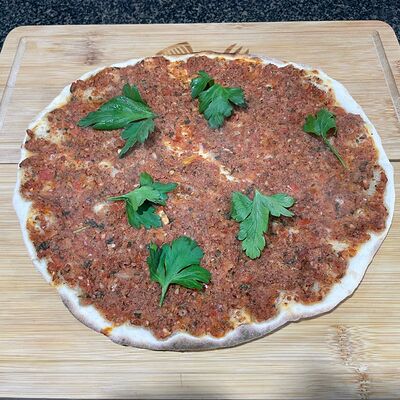 Тесто бездрожжевое, фарш (говядина и баранина), болгарский перец, помидоры, петрушка