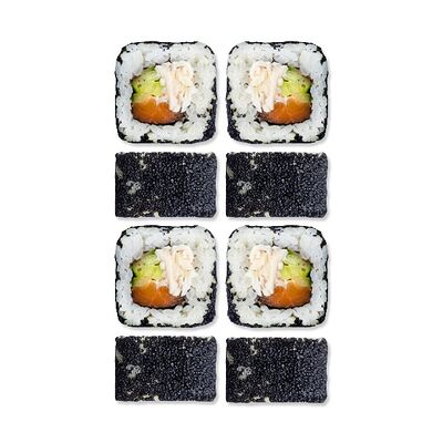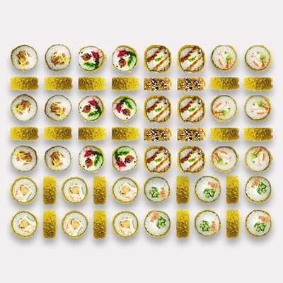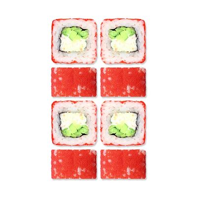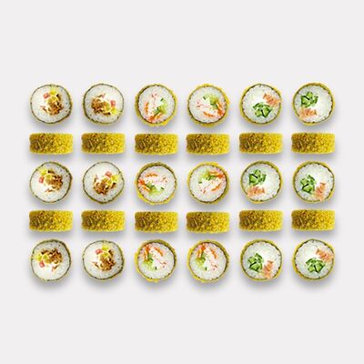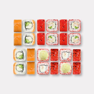Рис, нори, творожный сыр, креветка отварная (6 шт.). В набор не входят специи. Вы можете добавить необходимое количество имбиря, васаби и соевого соуса из раздела Специи