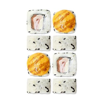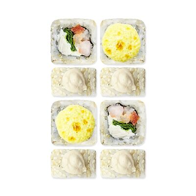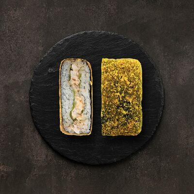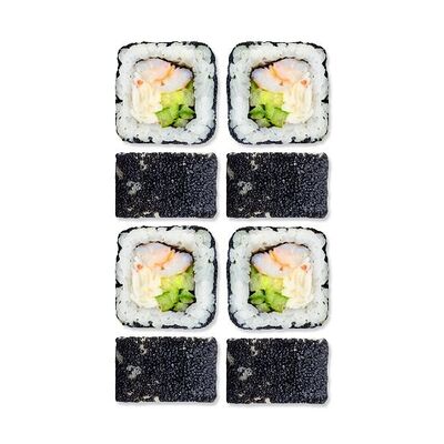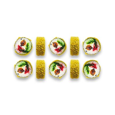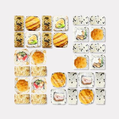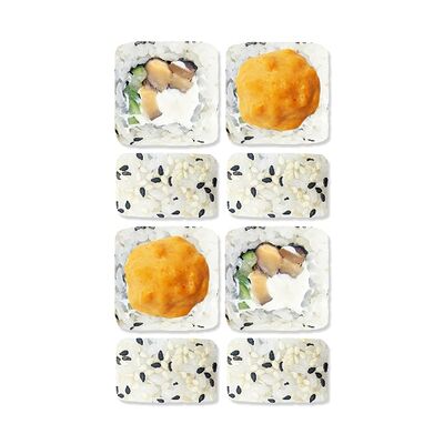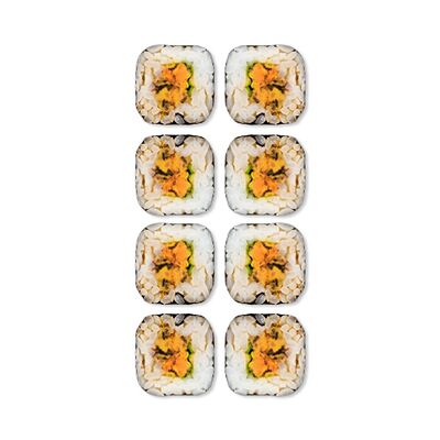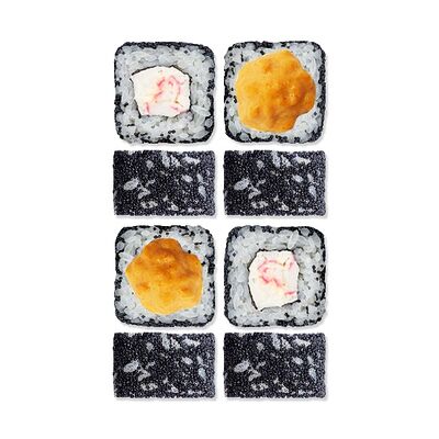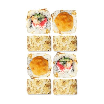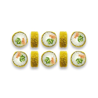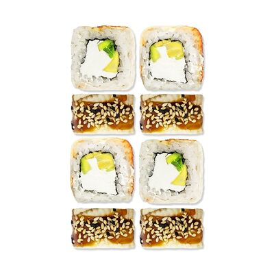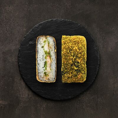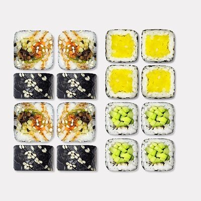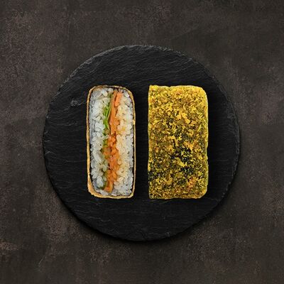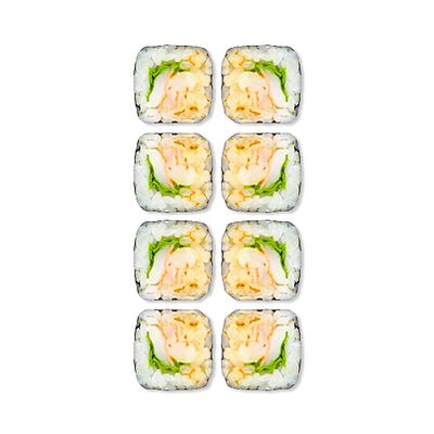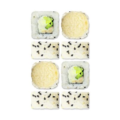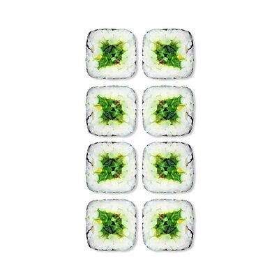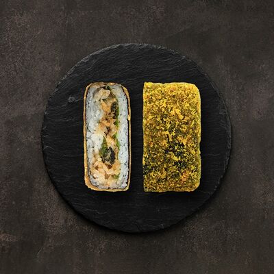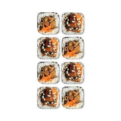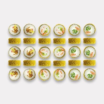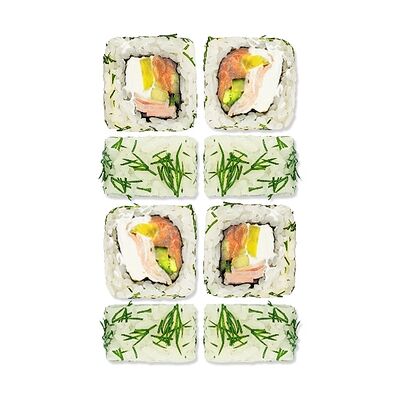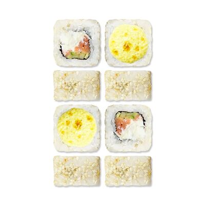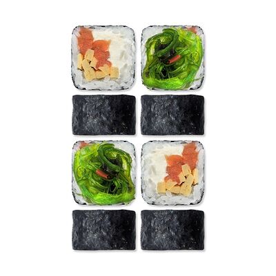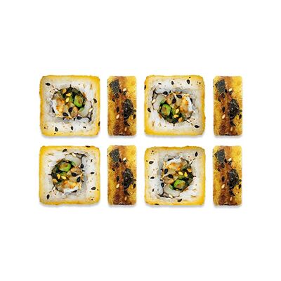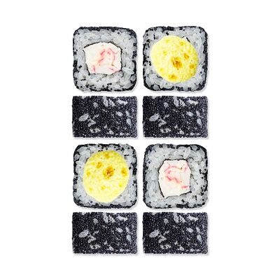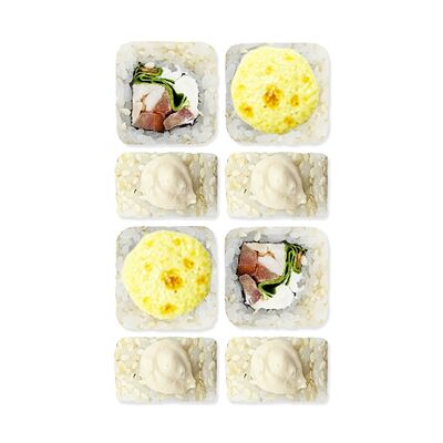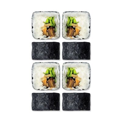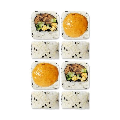 Рис, нори, маринованные грибы шиитаке (собственного производства), огурец, сыр творожный, блин томаго. Если вы заказываете роллы отдельно, добавьте необходимое количество имбиря, васаби и соевого соуса из раздела специи