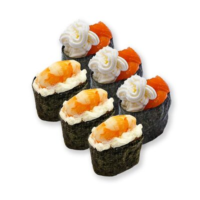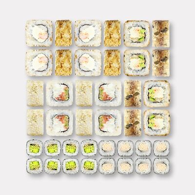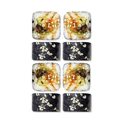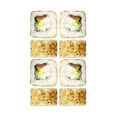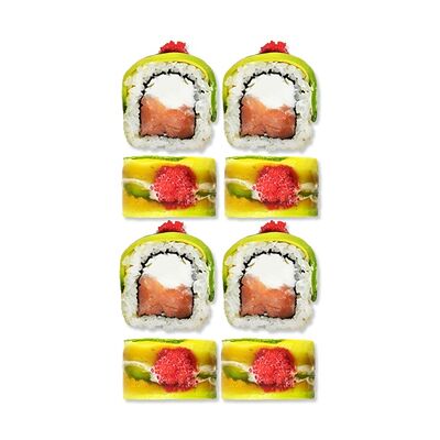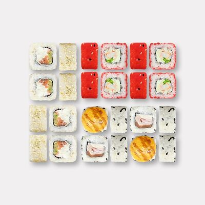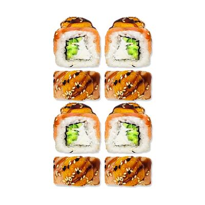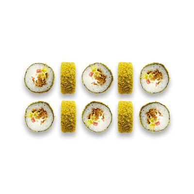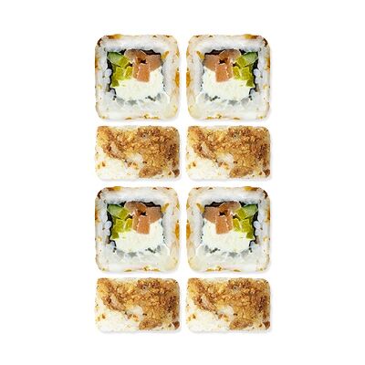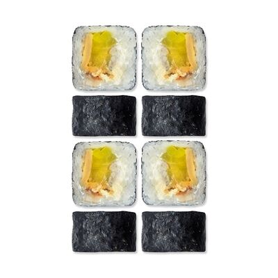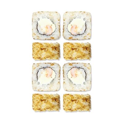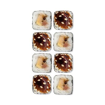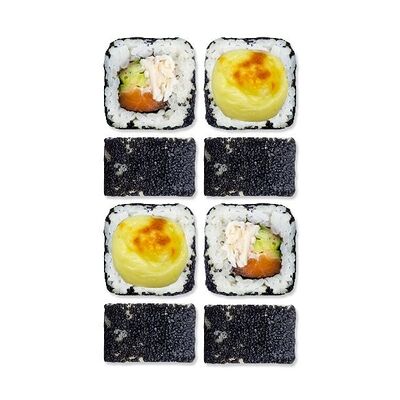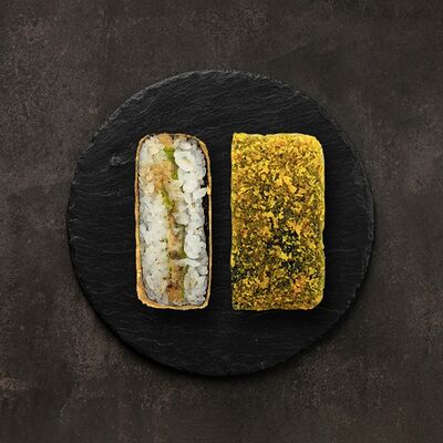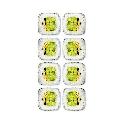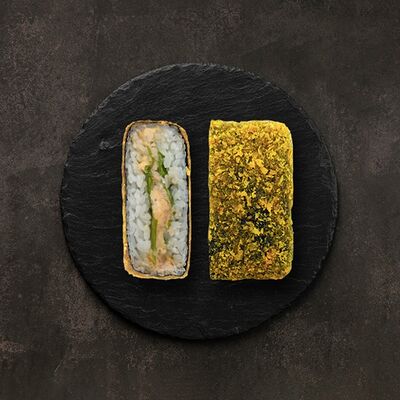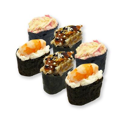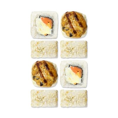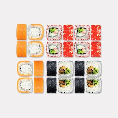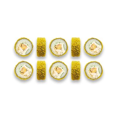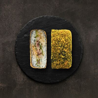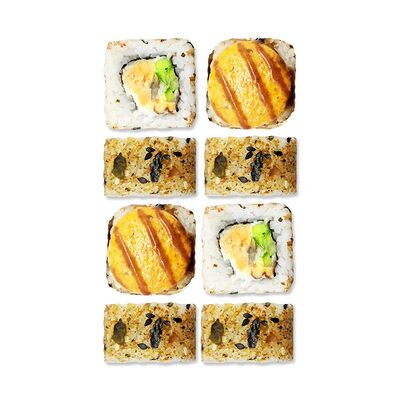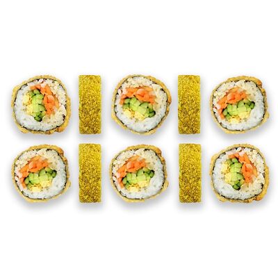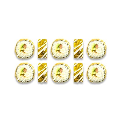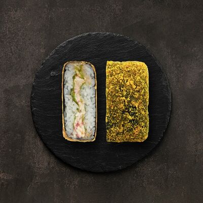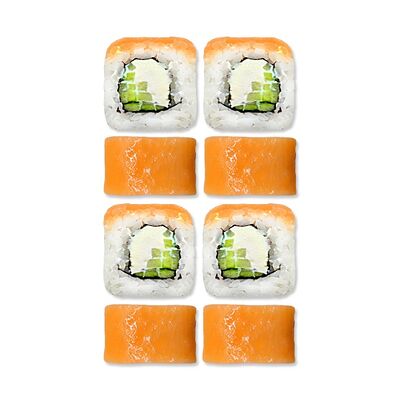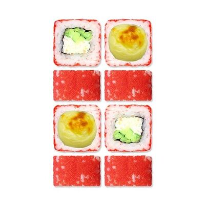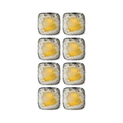 Рис, нори, маринованные грибы шиитаке (собственного производства), огурец, сыр творожный, блин томаго. Если вы заказываете роллы отдельно, добавьте необходимое количество имбиря, васаби и соевого соуса из раздела специи