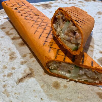 Курица на гриле 200 грамм, капуста свежая, помидор, огурец свежий, чесночный соус, томатный фирменный соус, Лаваш