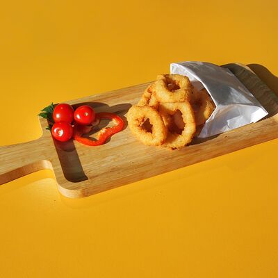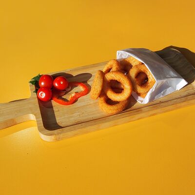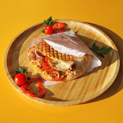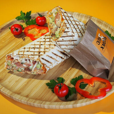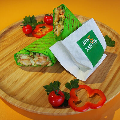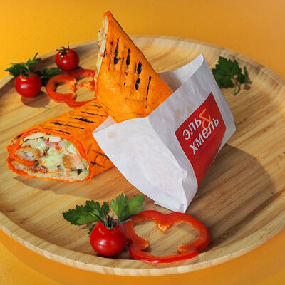 Лаваш, соусы: томатный и чесночный, пекинская капуста, свежий томат, свежий огурец, кальмар в панировке