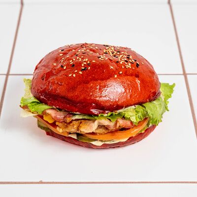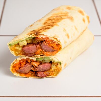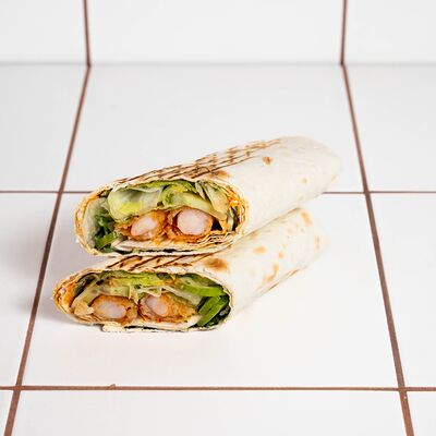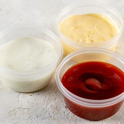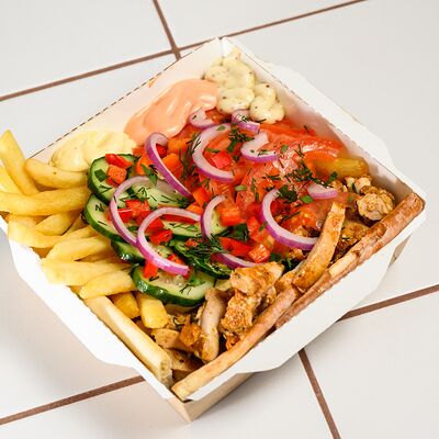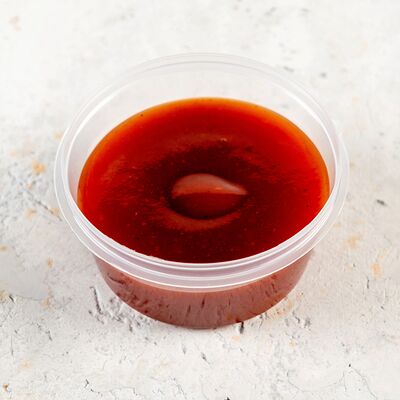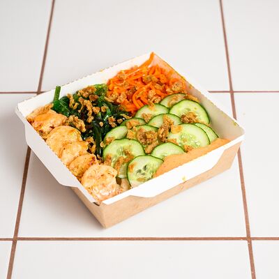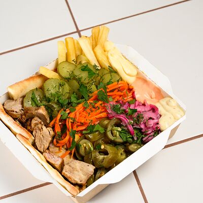 Креветки в соусе, морковь по-корейски, картофель фри, салат xука, лук фри, огурчик свежий, соус ореховый и пряно-острый спайси
