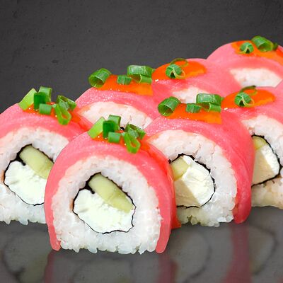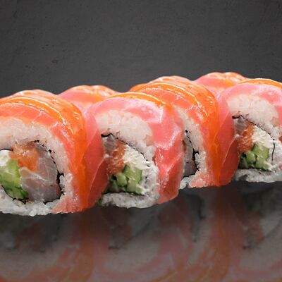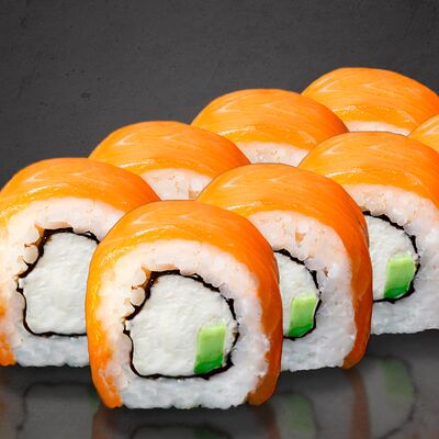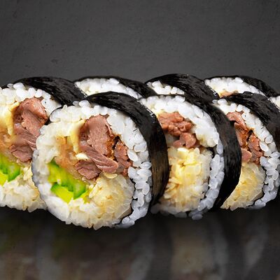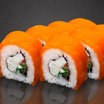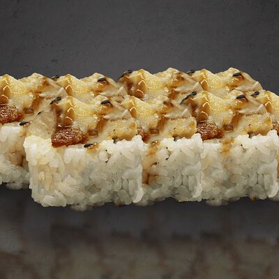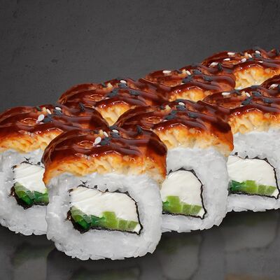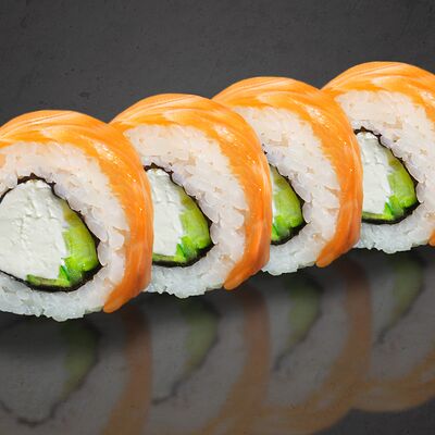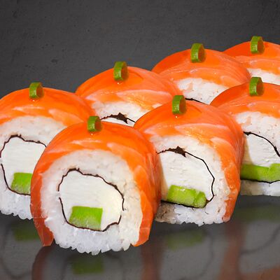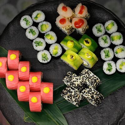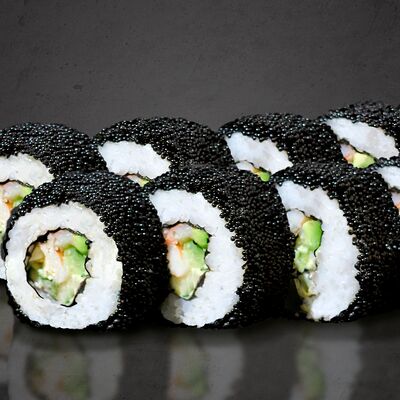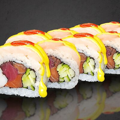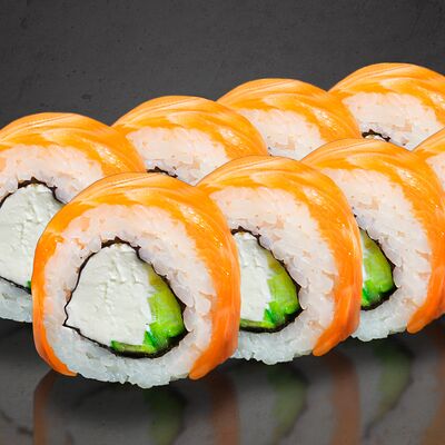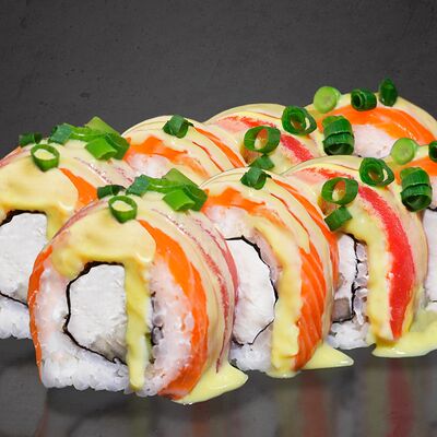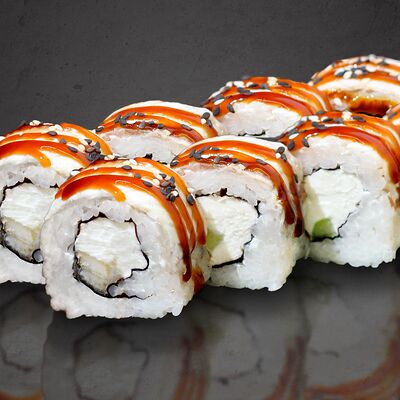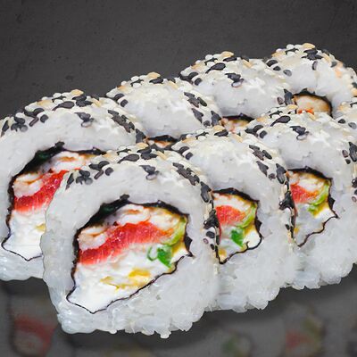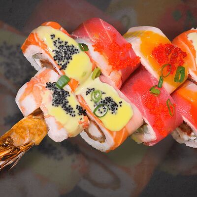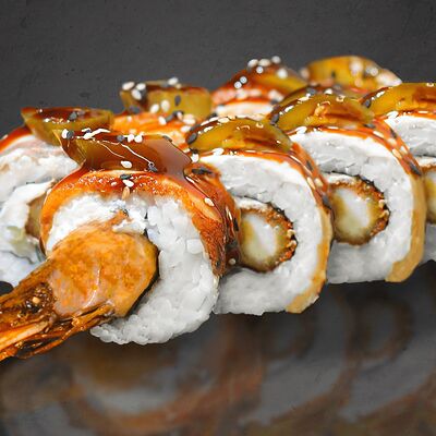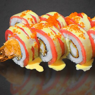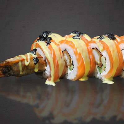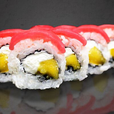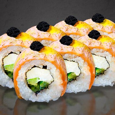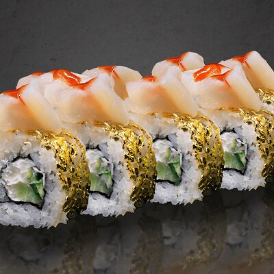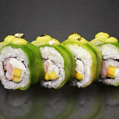Рис, сыр творожный, креветки, авокадо, манго, соус медовый васаби, нори, пищевое золото