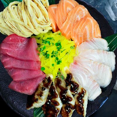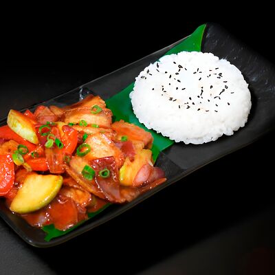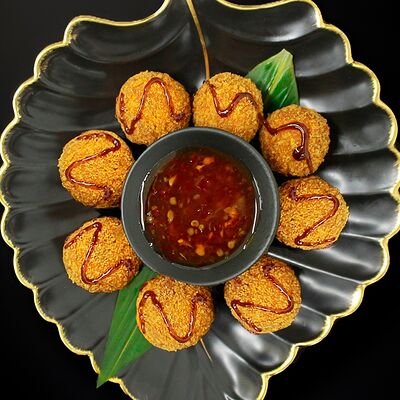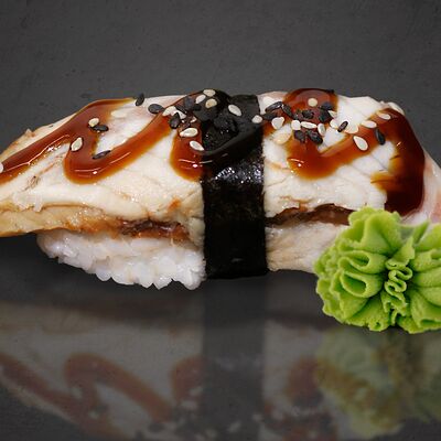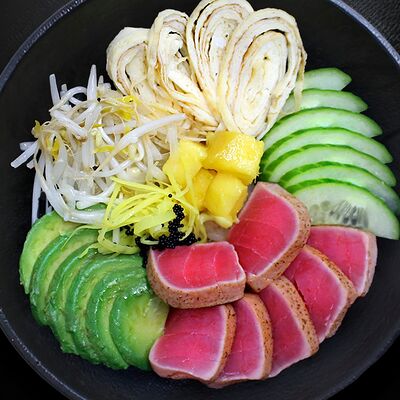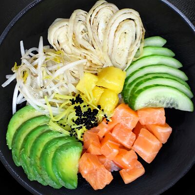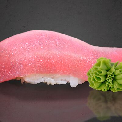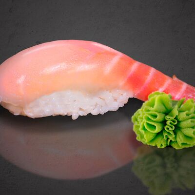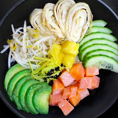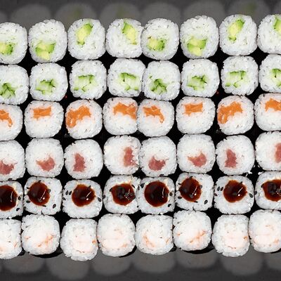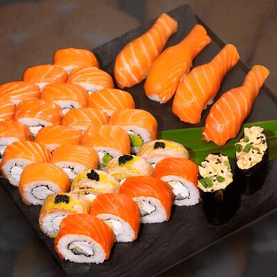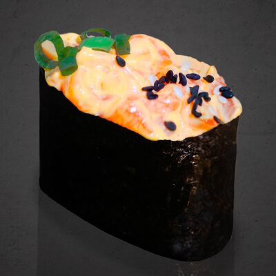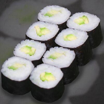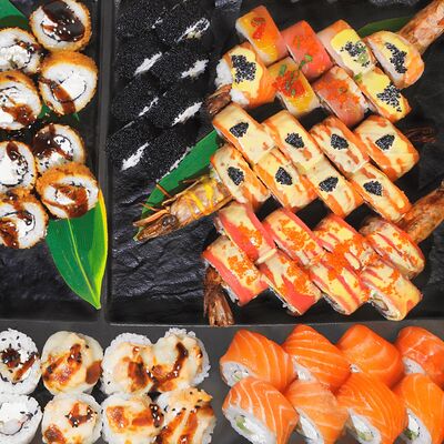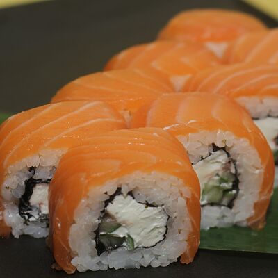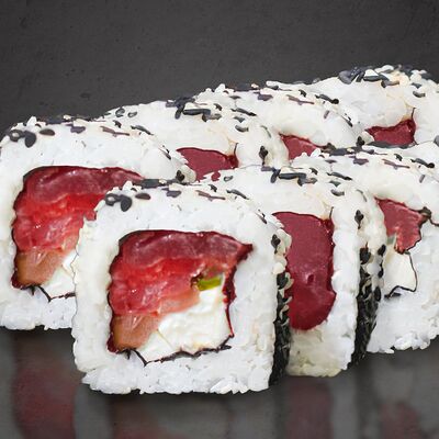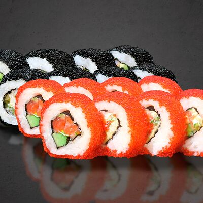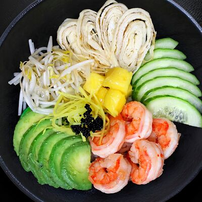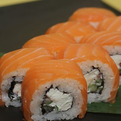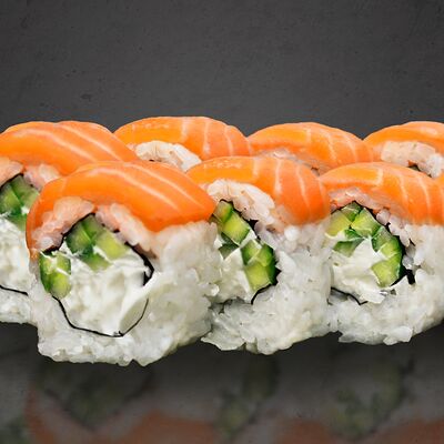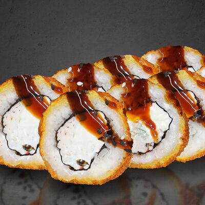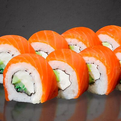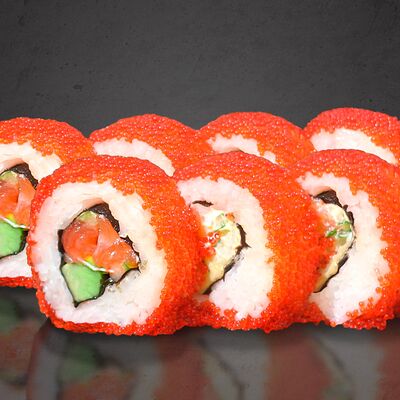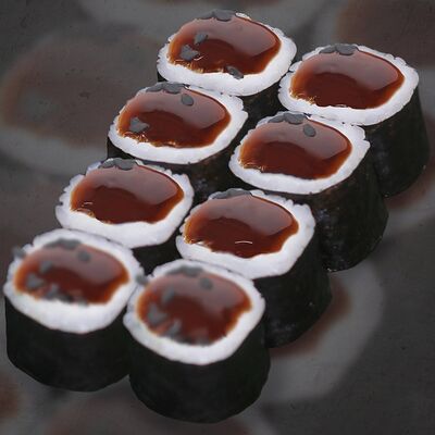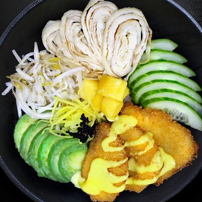 Рис, сыр творожный, креветки, авокадо, манго, соус медовый васаби, нори, пищевое золото