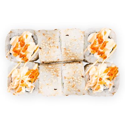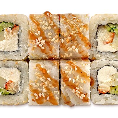 Курица копченая, гриль-соус, унаги-соус, кунжут
