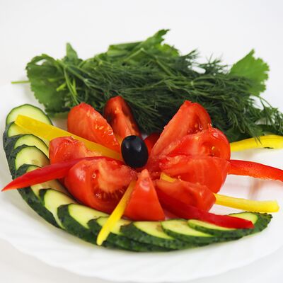 Помидоры, огурцы, маслины, сыр фета, перец сладкий, салат айсберг, оливковое масло, красный лук
