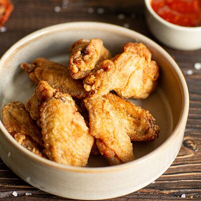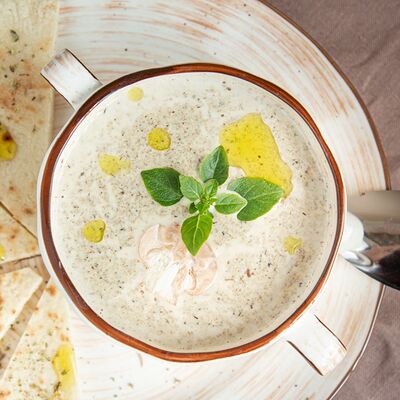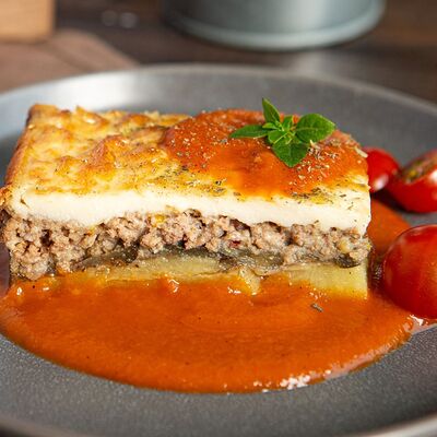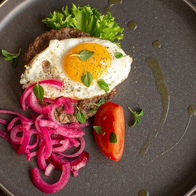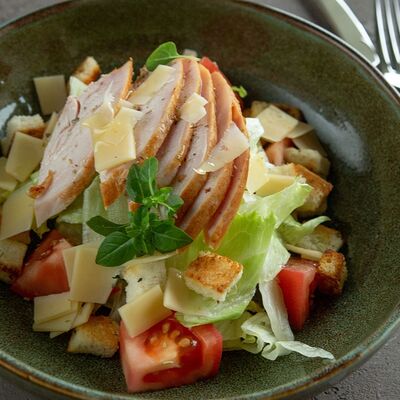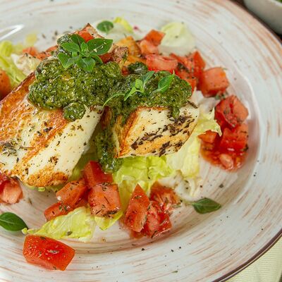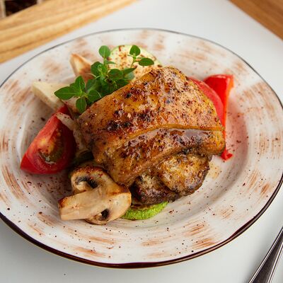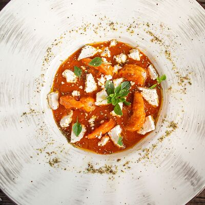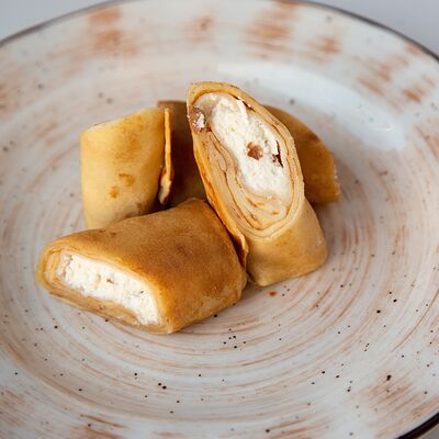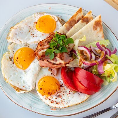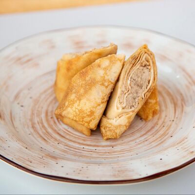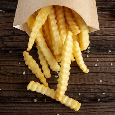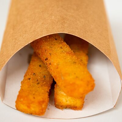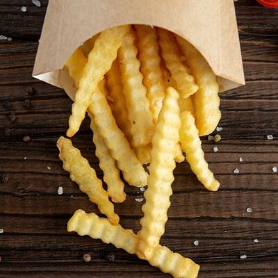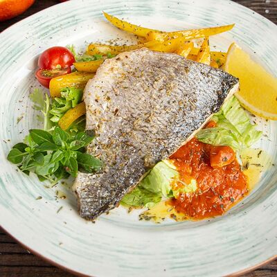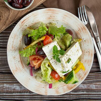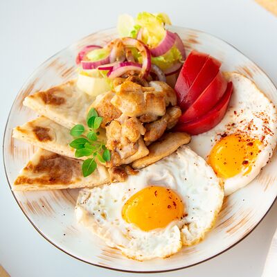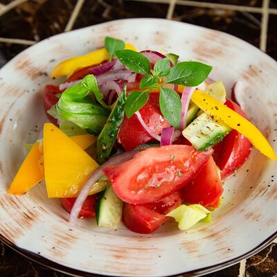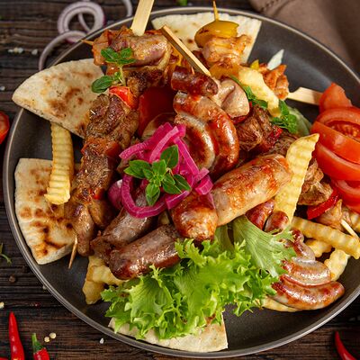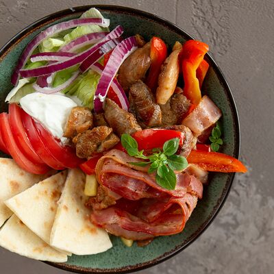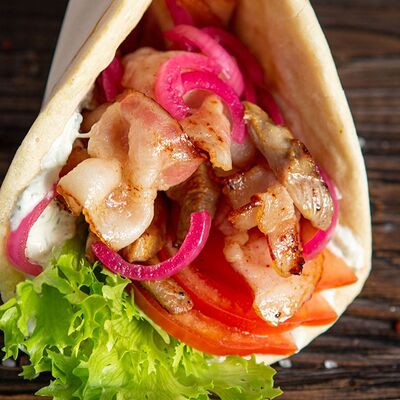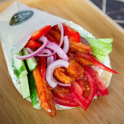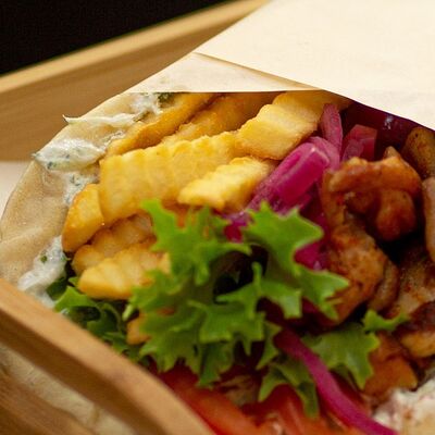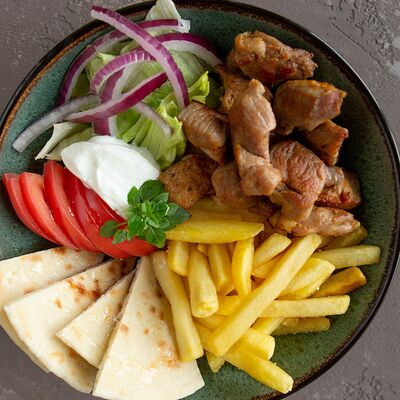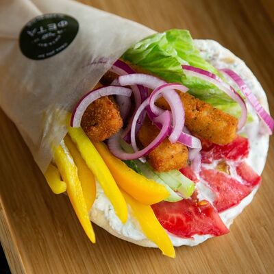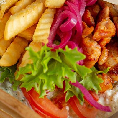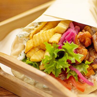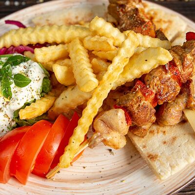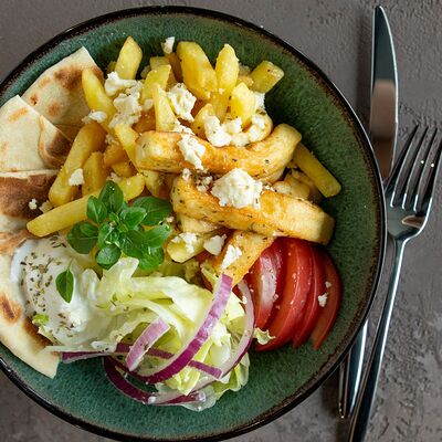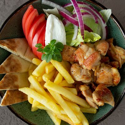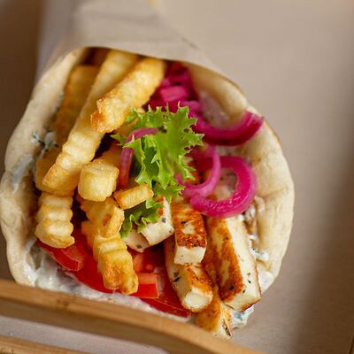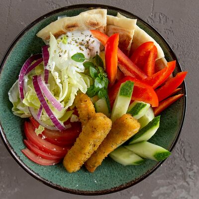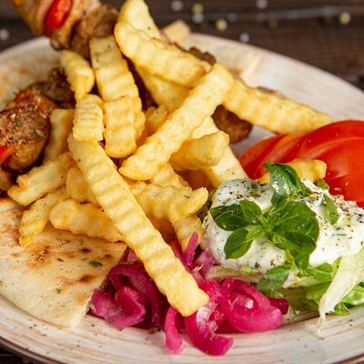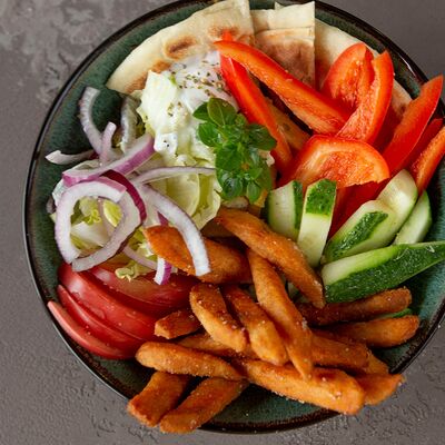 Батат фри, помидор, огурец, перец, красный лук, соус дзадзики, пита