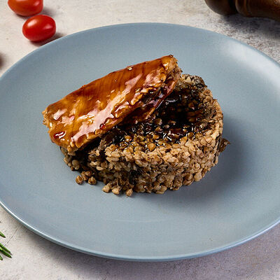 Неповторимое сочетание нежного филе грудки индейки, пикантных соусов, придающих мясу неповторимый вкус и ароматной гречневой каши с шампиньонами.