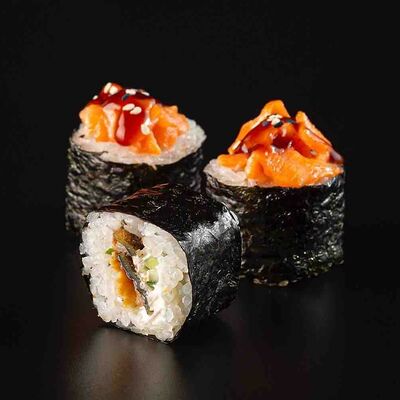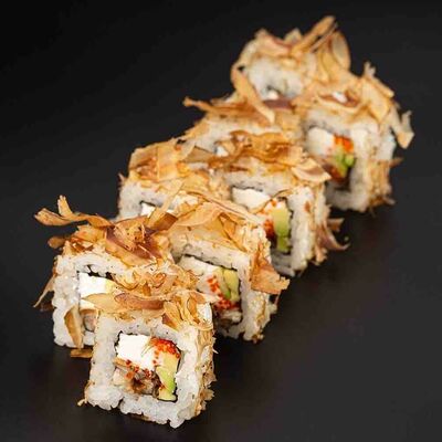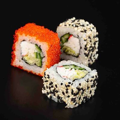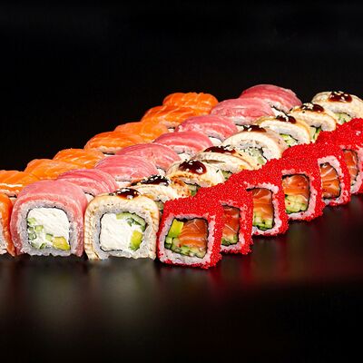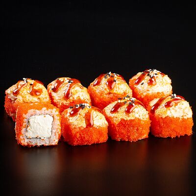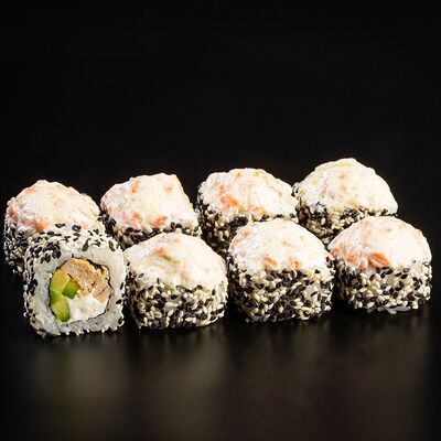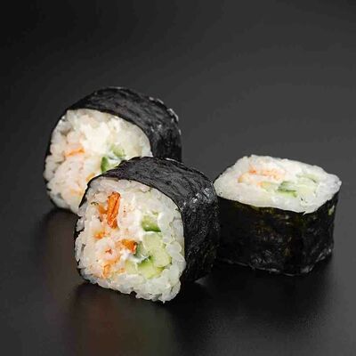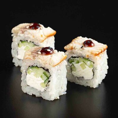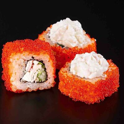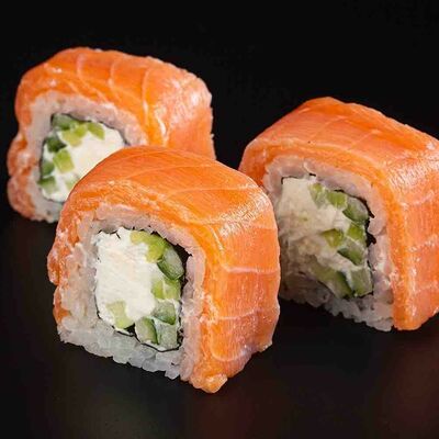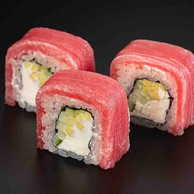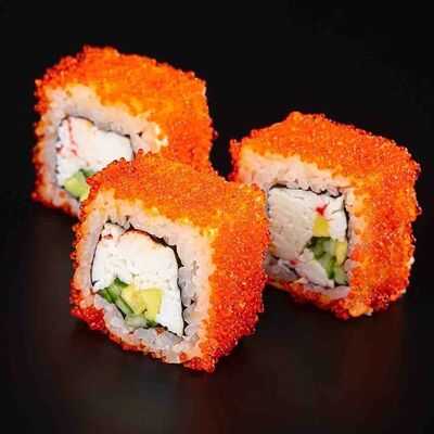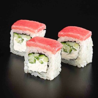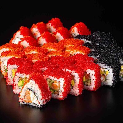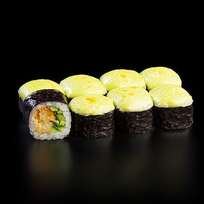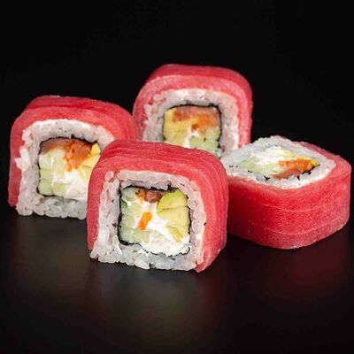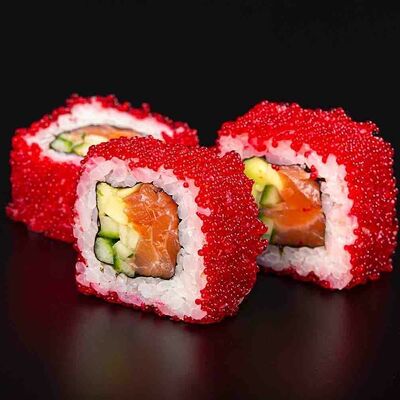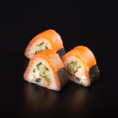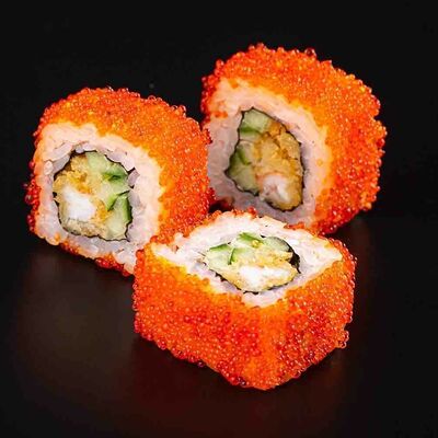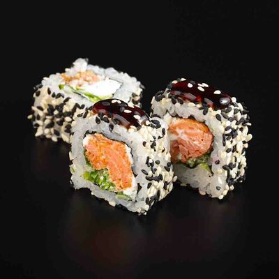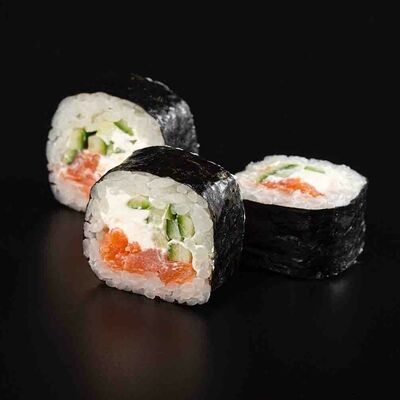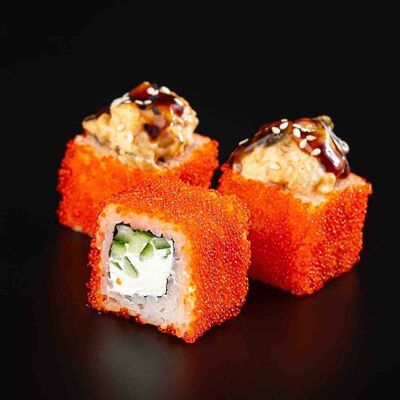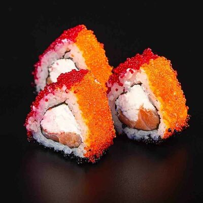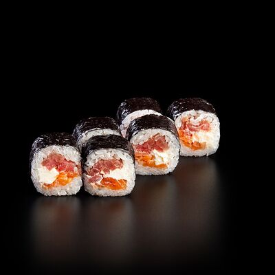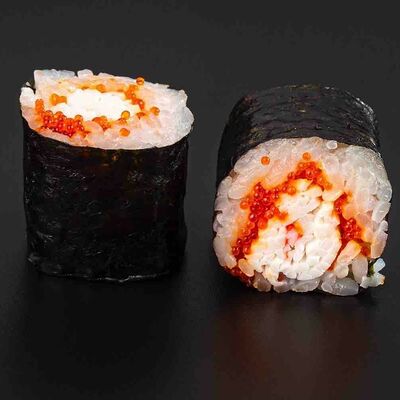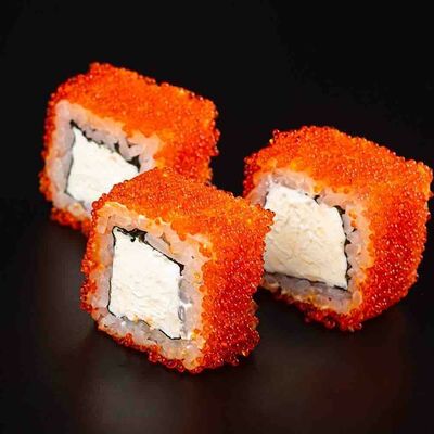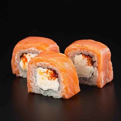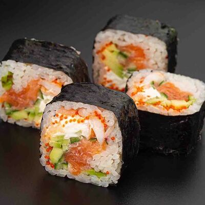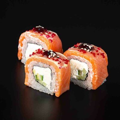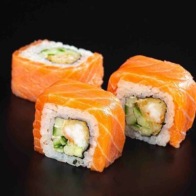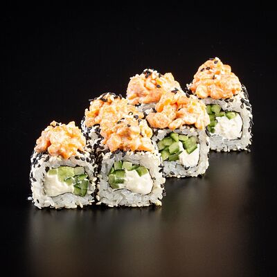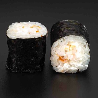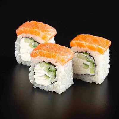 Рис, креветка тигровая, лосось, огурец, сыр креметте, авокадо, водоросли нори (4 шт.). Подаётся с васаби (1 шт.), соевым соусом (1 шт.) и имбирём (1 шт.)