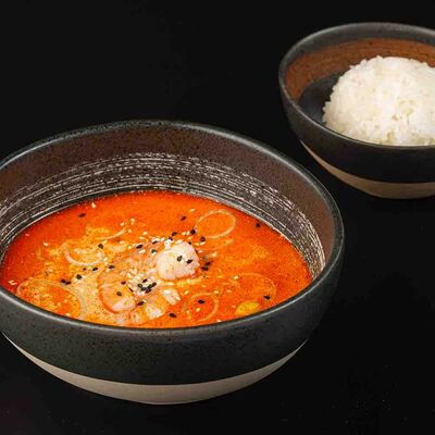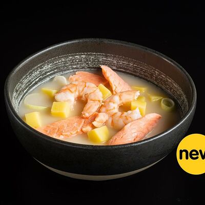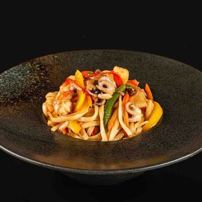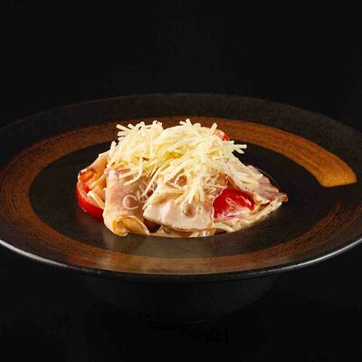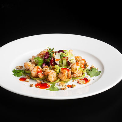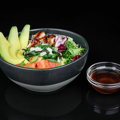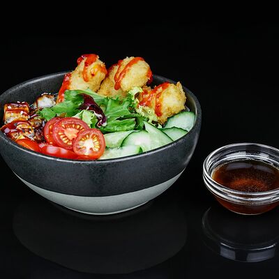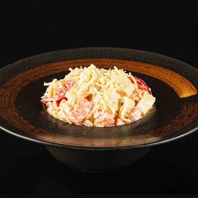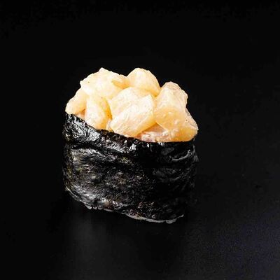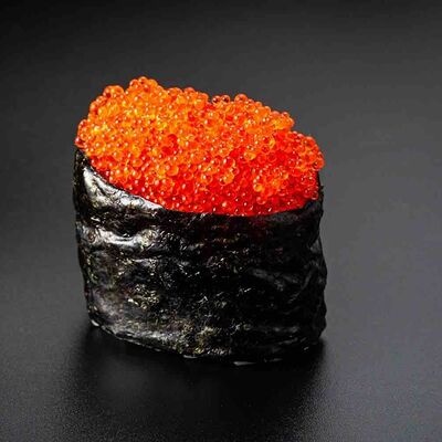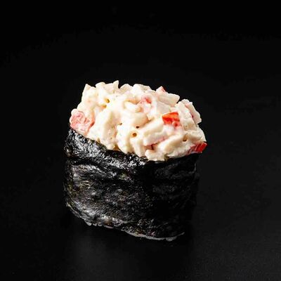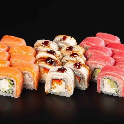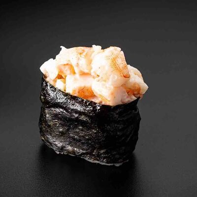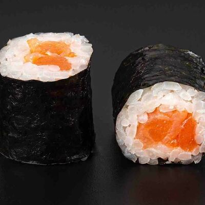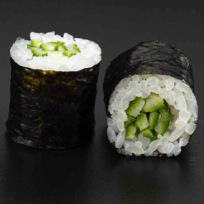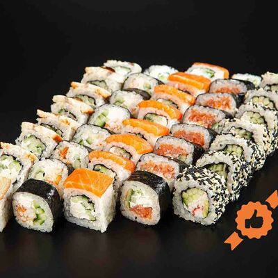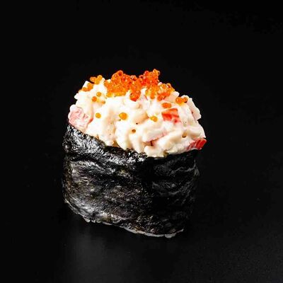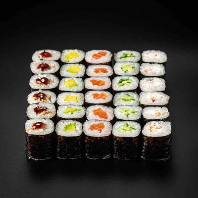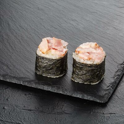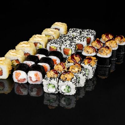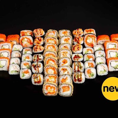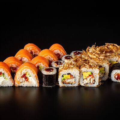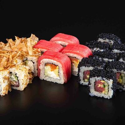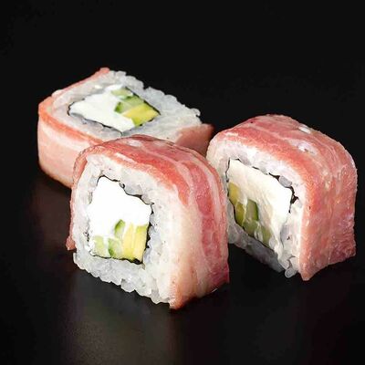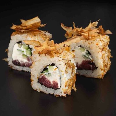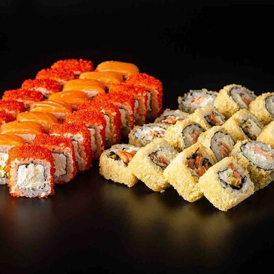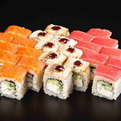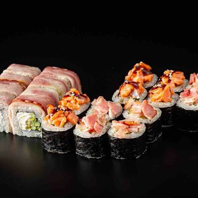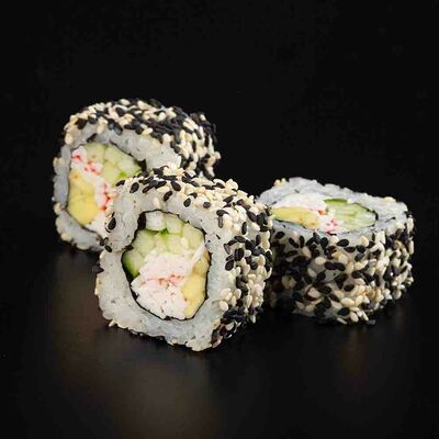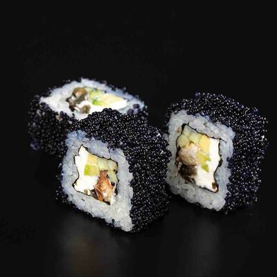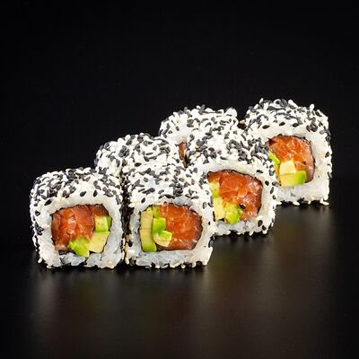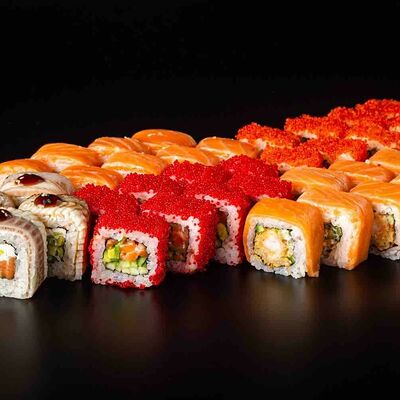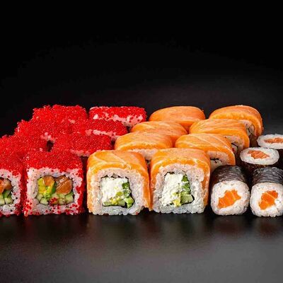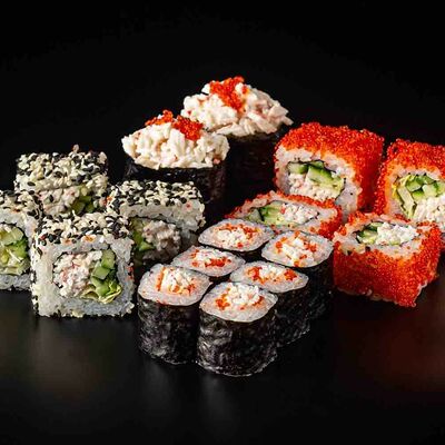 Рис, креветка тигровая, лосось, огурец, сыр креметте, авокадо, водоросли нори (4 шт.). Подаётся с васаби (1 шт.), соевым соусом (1 шт.) и имбирём (1 шт.)