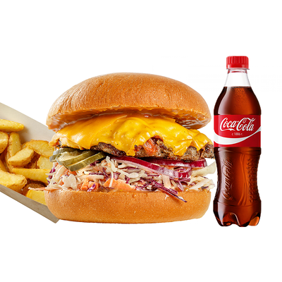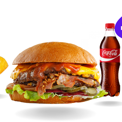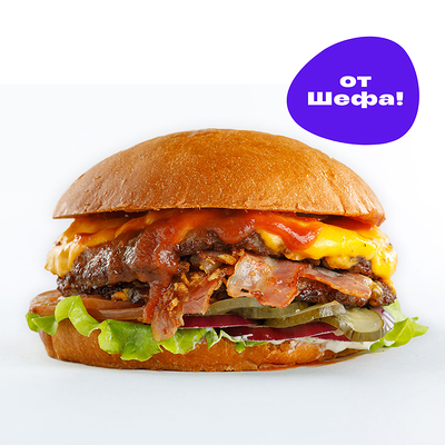 Булочка, салат, бекон, помидор, куриная котлета, сыр, огурец, лук и соус