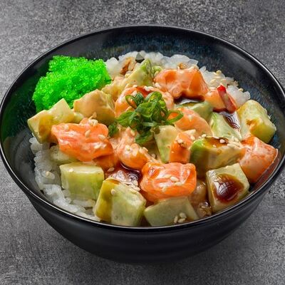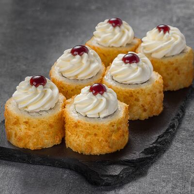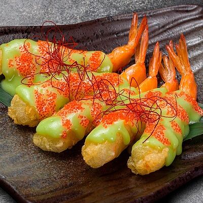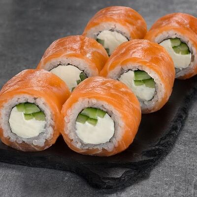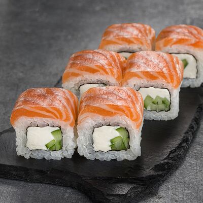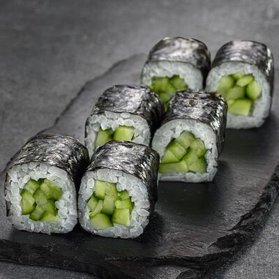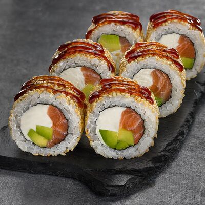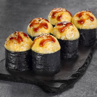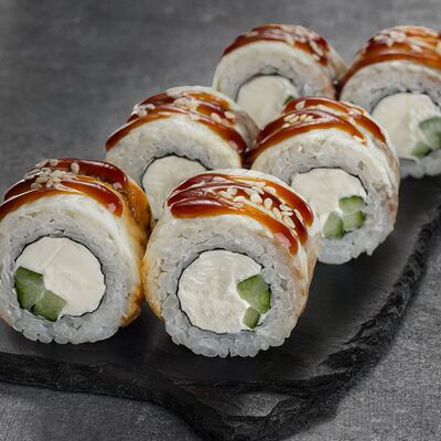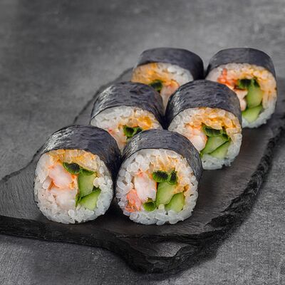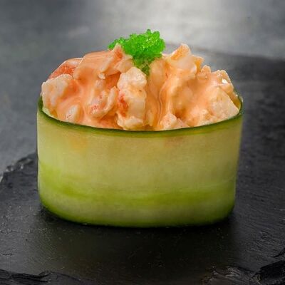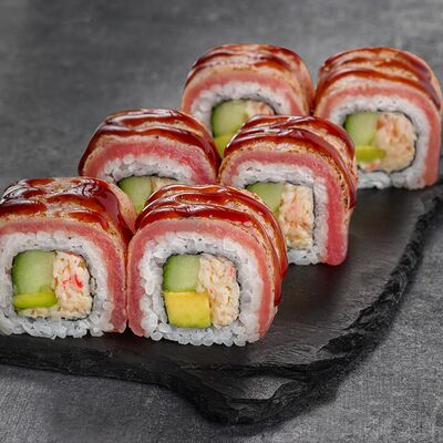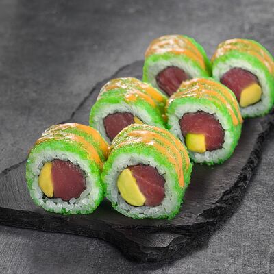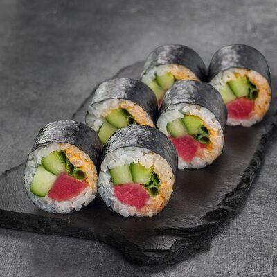 Ролл с тунцом, огурцом, рисом, зеленым луком с соусом спайси в листе нори